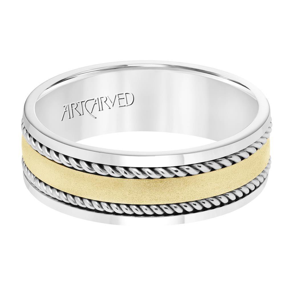 Made from 14K white gold with 14K yellow gold center, dual rope accents, satin finish, and polished edges, 7mm width. Comfort-fit, durable.