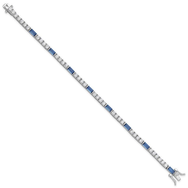 Handcrafted in sterling silver with rhodium plating. Set with alternating blue and white round-cut cubic zirconia stones. 7.25 inches in length, polished finish for durability and shine.