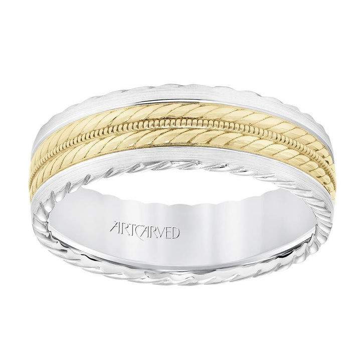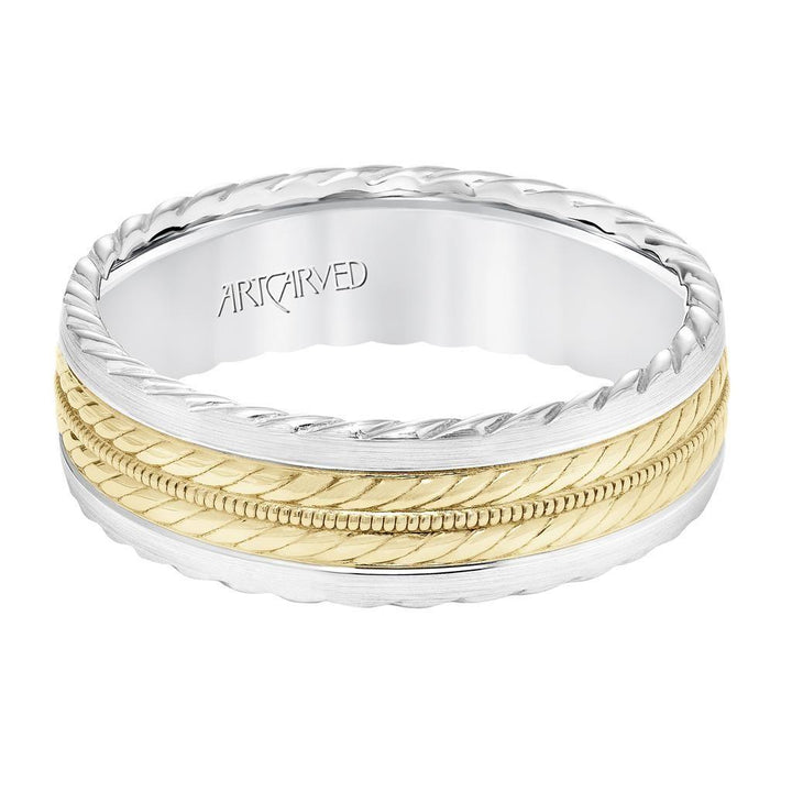 Crafted in 14k white gold with 14k yellow gold center and dual rope/milgrain inlay. 7mm width, domed profile, rope edge detailing, high-polish finish.