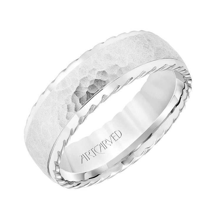 Crafted in 14K white gold. 7mm width. Domed hammered center, rope edge detailing. Polished finish, hypoallergenic, durable, comfortable for everyday wear.