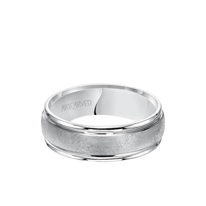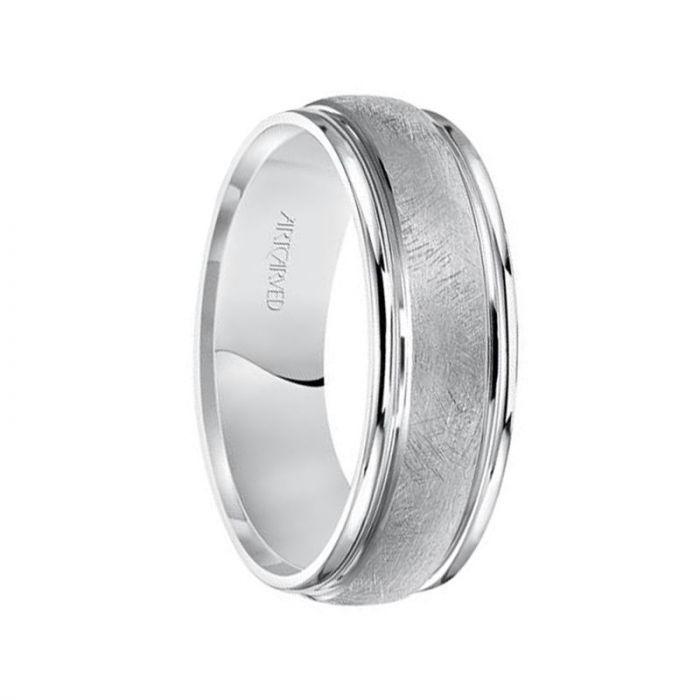 14k white gold. 7.5mm width. Crystalline domed finish center with dual ridge accents and flat edges. Lifetime resizing and replacement warranty by Artcarved.