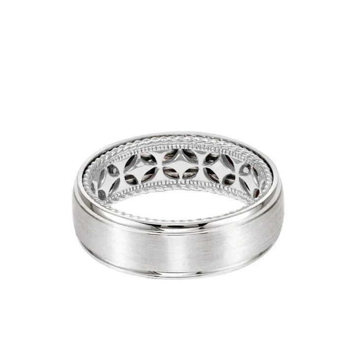 14k White Gold Wedding Band Diamond Pattern Rope Edge Inner Design Domed Brushed Finish Round Edges By Artcarved - 7mm