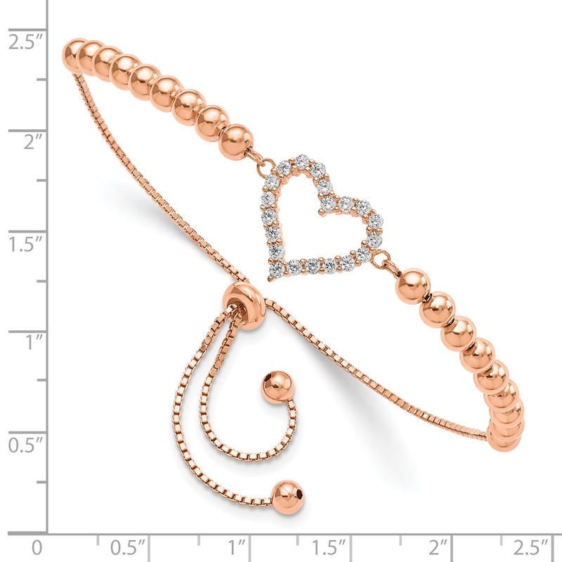 This bracelet is made of Rose-tone Plated Sterling Silver with a Polished Finish. It is an Adjustable Bracelet featuring a Beaded chain and a CZ Heart.