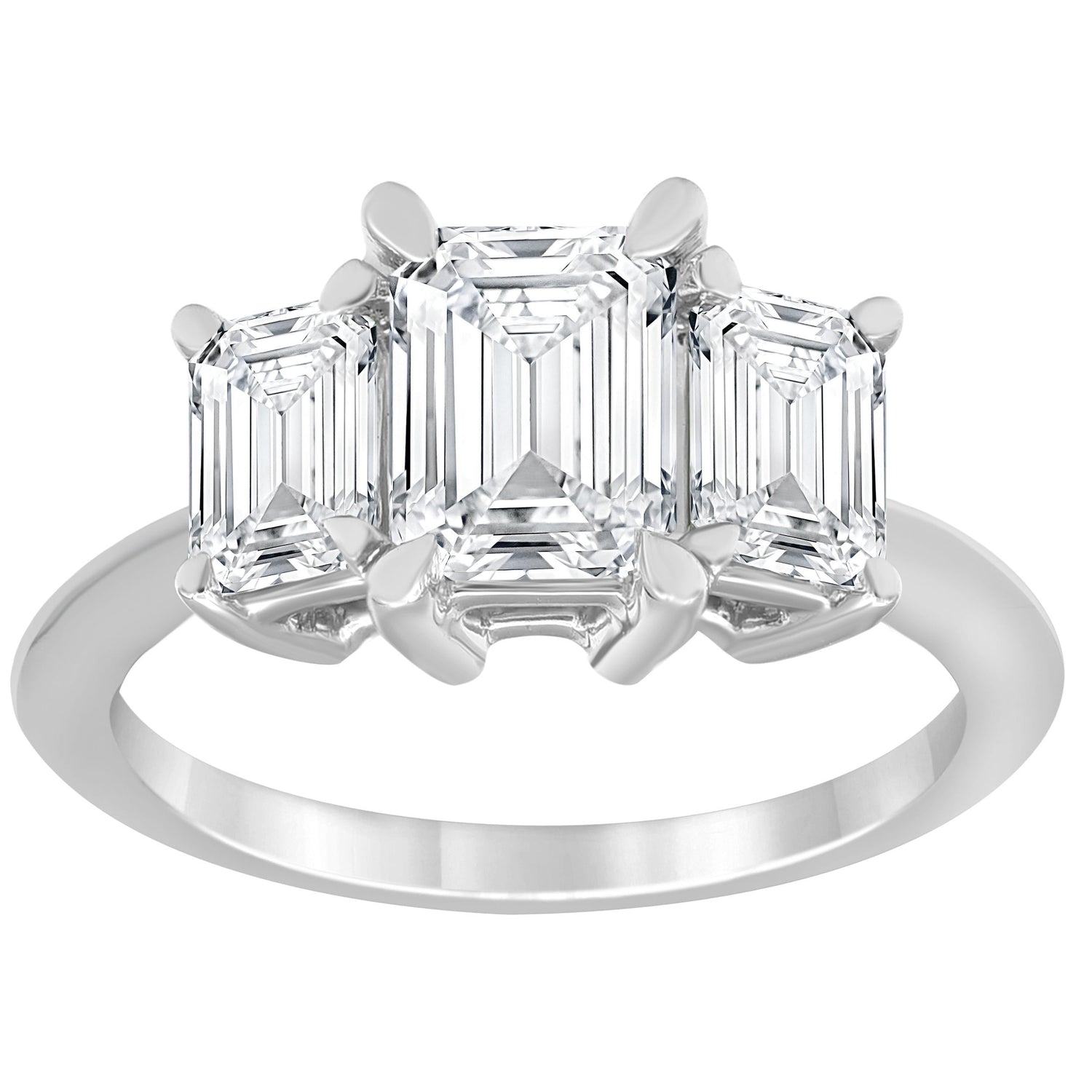 This 3.00 cttw 3 stone Ring with 1.50 ct Emerald Lab Diamond Center Stone is a study in geometric splendor and timeless glamour. The aesthetic is elegant and balanced, highlighting the crisp, step-cut facets of a magnificent 1.50 ct Emerald Lab-Created Diamond center stone. The three-stone design, with a total weight of 3.00 cttw, is set in luminous 14K White Gold with a polished finish. This ring is a sophisticated symbol of a powerful, enduring commitment, perfect for a bride who favors classic, linear designs.