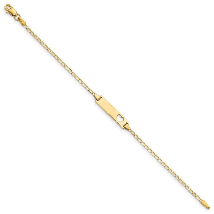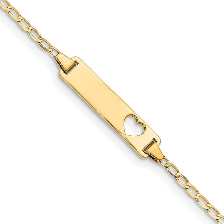 This ID bracelet is crafted from 14K Yellow Gold with a polished finish. It features a Flat Curb Link chain and a cut-out heart on the ID plate.