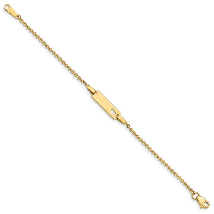 This children's ID bracelet is crafted from 14K Yellow Gold with a polished finish and a heart ID plate.