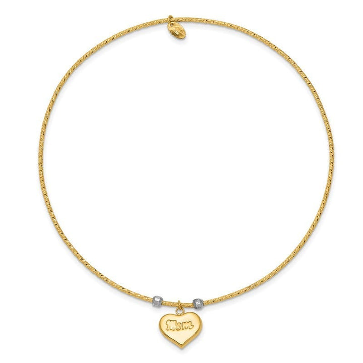 This bangle is crafted from 14K Two-tone Gold with a polished finish. It features diamond-cut detailing, a heart motif, and the word "Mom".