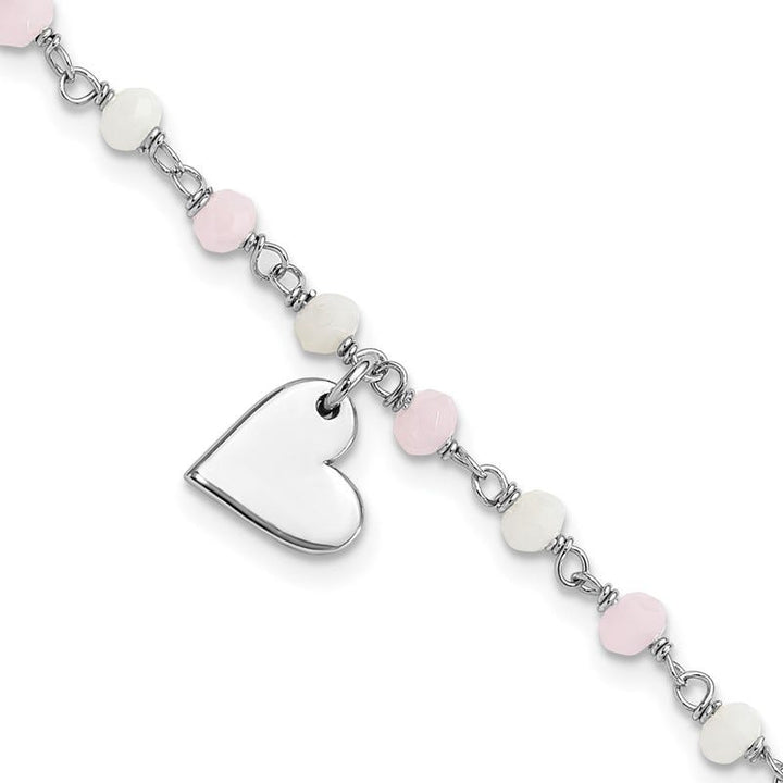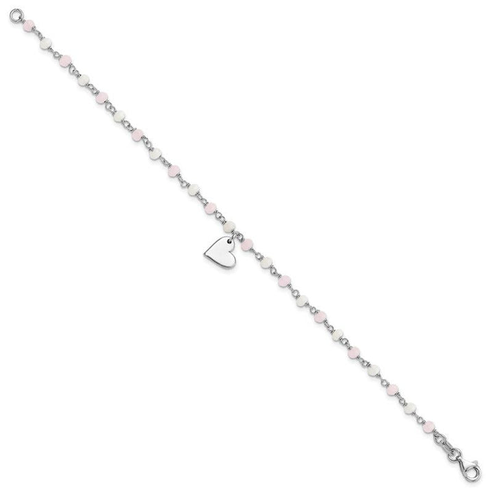 This Sterling Silver Rhodium-plated Heart Pink/White Glass Beads Bracelet is a colorful and feminine accessory. The aesthetic is bright and vibrant, featuring Rhodium-plated Sterling Silver with a Heart charm and strung Pink/White Glass Beads. The bracelet is 7.5 inches long.