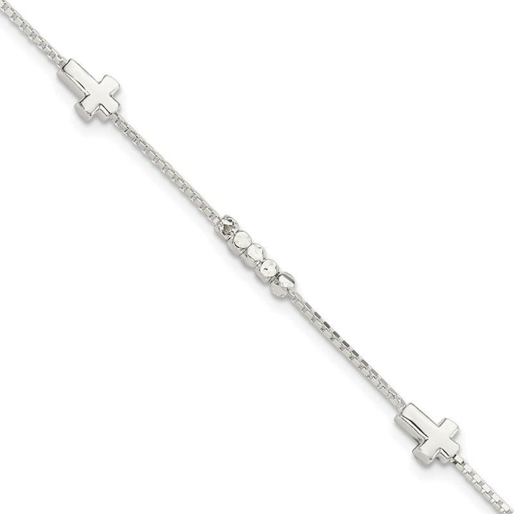 This bracelet is crafted from Sterling Silver with a polished finish. It features Fancy Bead links and a Cross motif. It includes a 1-inch extension.