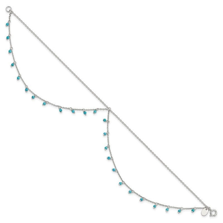 This anklet is crafted from Sterling Silver with a polished finish (implied). it features a Double Chain and Turquoise Beads.