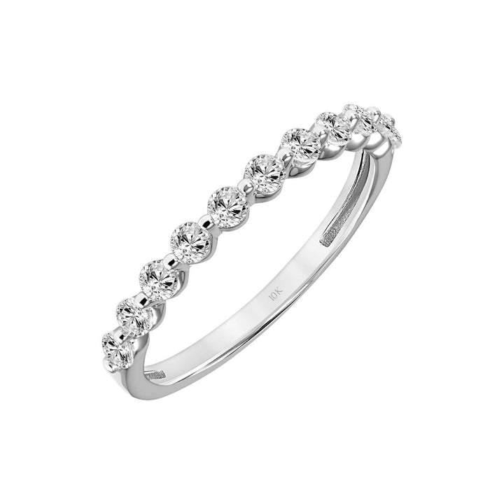 This wedding band is crafted from 10k White Gold with a polished finish. It is set with 2.2mm Lab Grown White Sapphire stones.