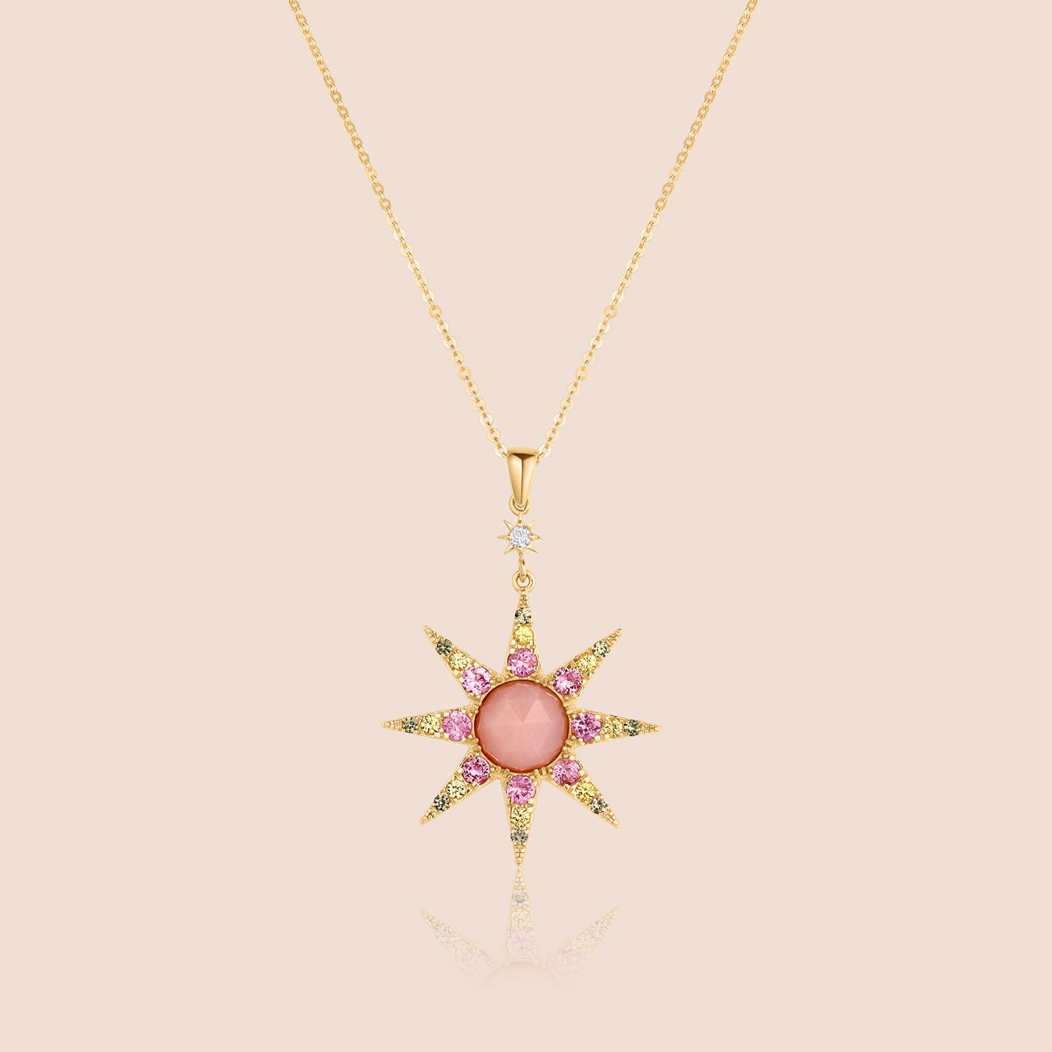 This Eden Star Pendant by Ora Nicole captures celestial beauty in radiant hues. Centered with a luminous pink moonstone, the handcrafted star design glows with multicolor sapphires, citrines, and diamonds. The candy-pink tones of the moonstone are accentuated by a 14K rose gold setting, symbolizing love, creativity, and inner light. Each facet reflects Nicole’s attention to artistry and color harmony — a statement of both modern femininity and timeless magic.