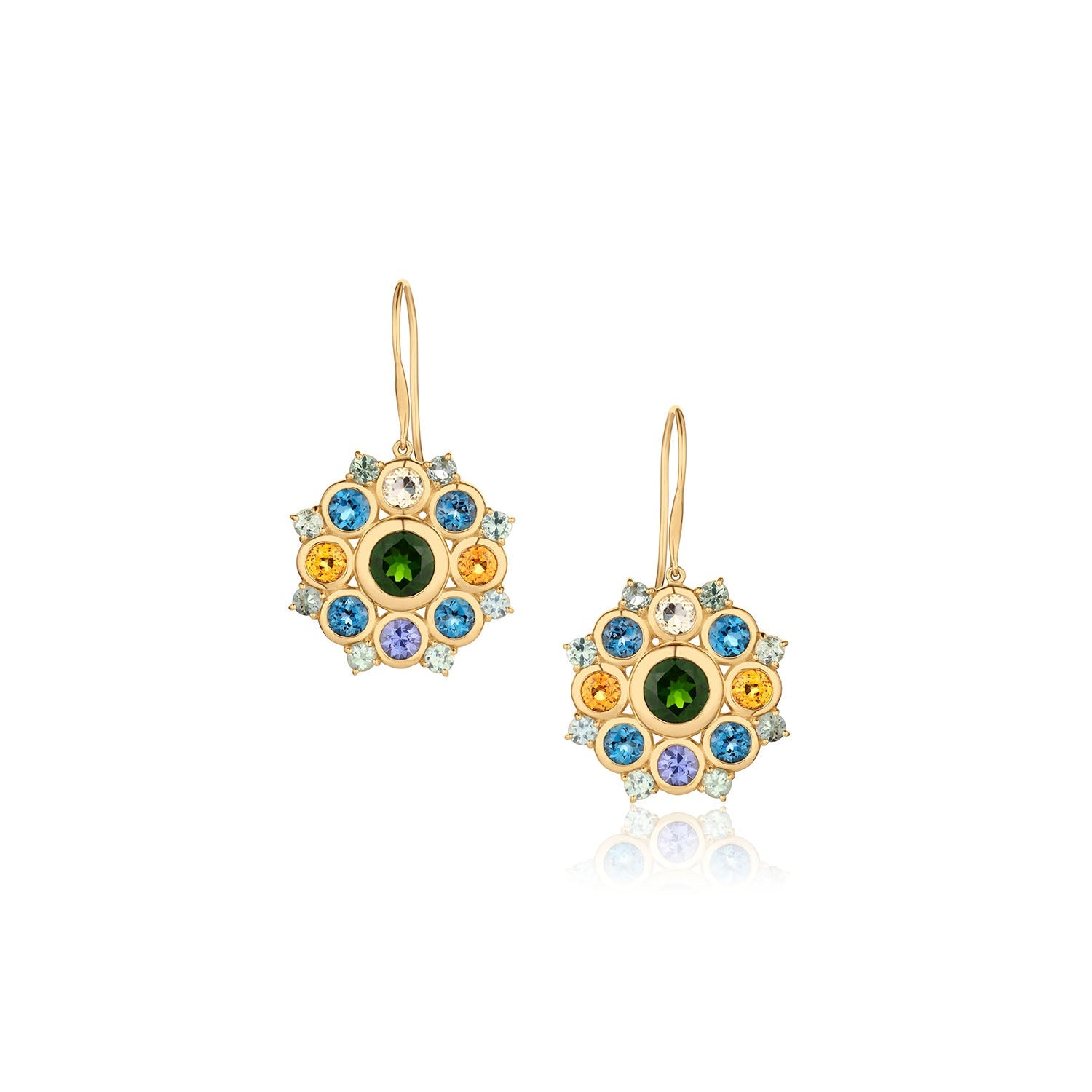These Eternal Blossom Earrings by Ora Nicole radiate joyful color and light, capturing the essence of springtime in bloom. Their playful arrangement of multicolor gemstones—yellow, light green, and purple sapphires accented with citrine, London blue topaz, and diopside—creates a vibrant, feminine statement. Designed to elevate both casual and dressy looks, these earrings symbolize renewal and vitality, infusing your style with color and confidence. Perfect for those who love to express their individuality through gemstones that sparkle with natural beauty.