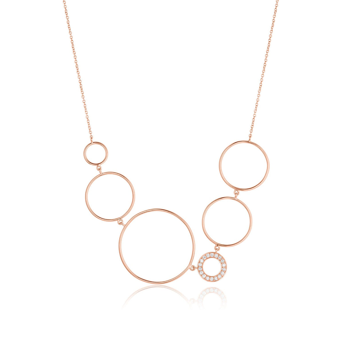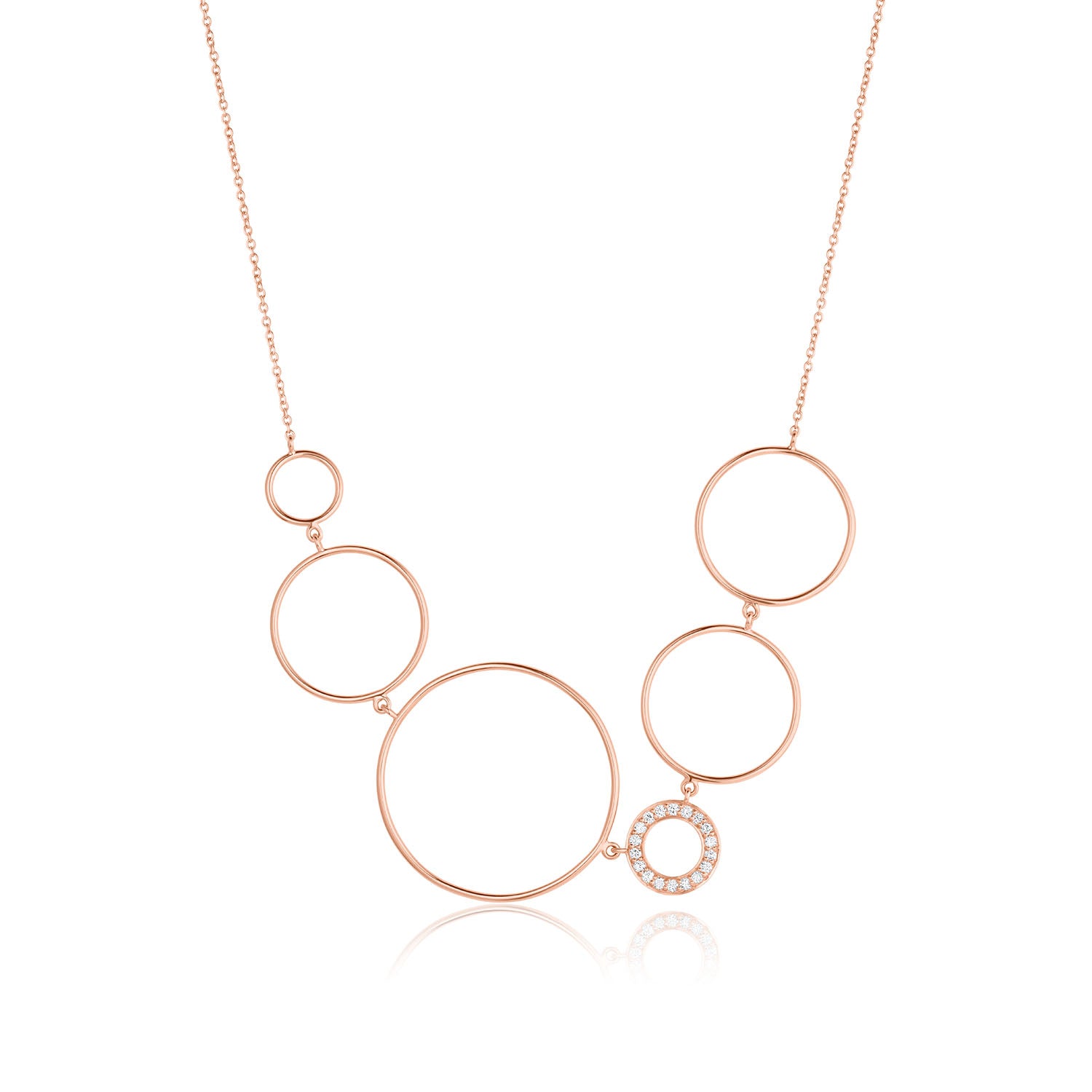 Handcrafted in 14K gold with 0.12 TDW of pave diamonds. Circles measure 30 mm, 25 mm, and 15 mm (diamond circle). Adjustable cable chain 16–20 inches with large lobster clasp. Available in yellow, white, or rose gold.