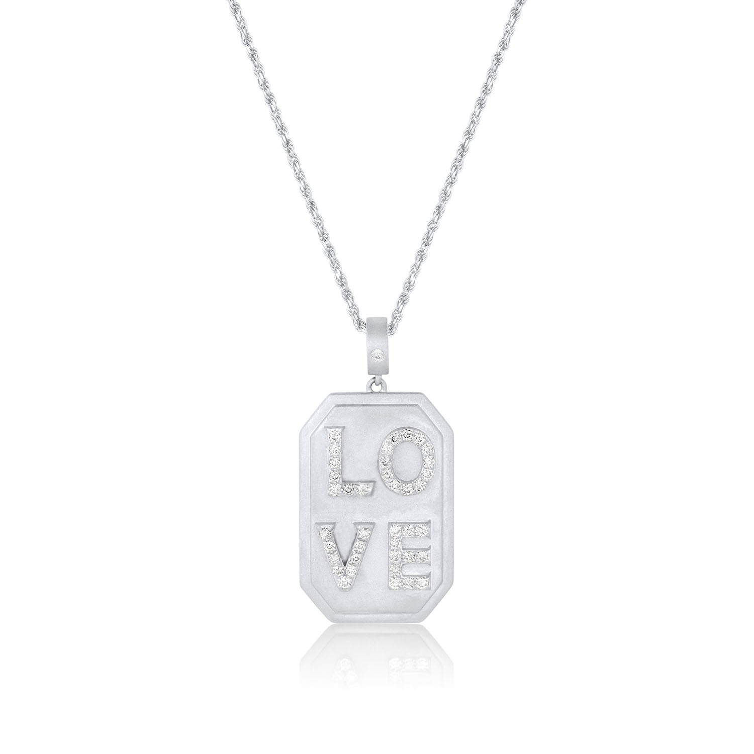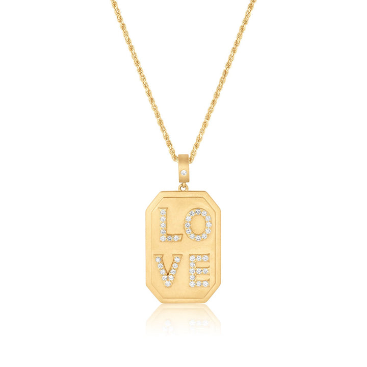 Handcrafted in 14K gold (13 g) with 0.52 total diamond weight (TDW) spelling “LOVE.” Measures 13 x 20 mm. Shown in polished finish, also available in high-shine. Customizable with initials. Pendant only, chain not included.