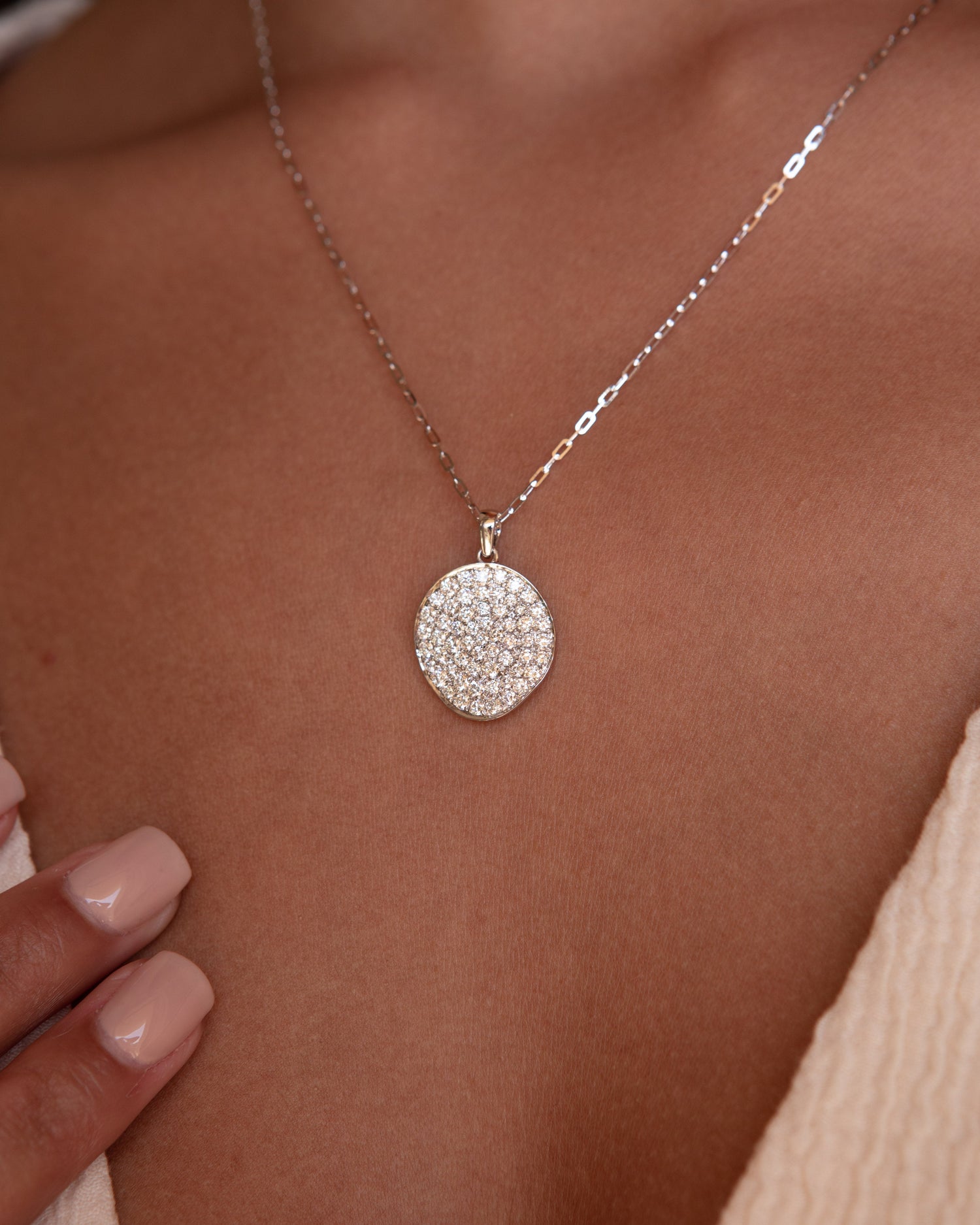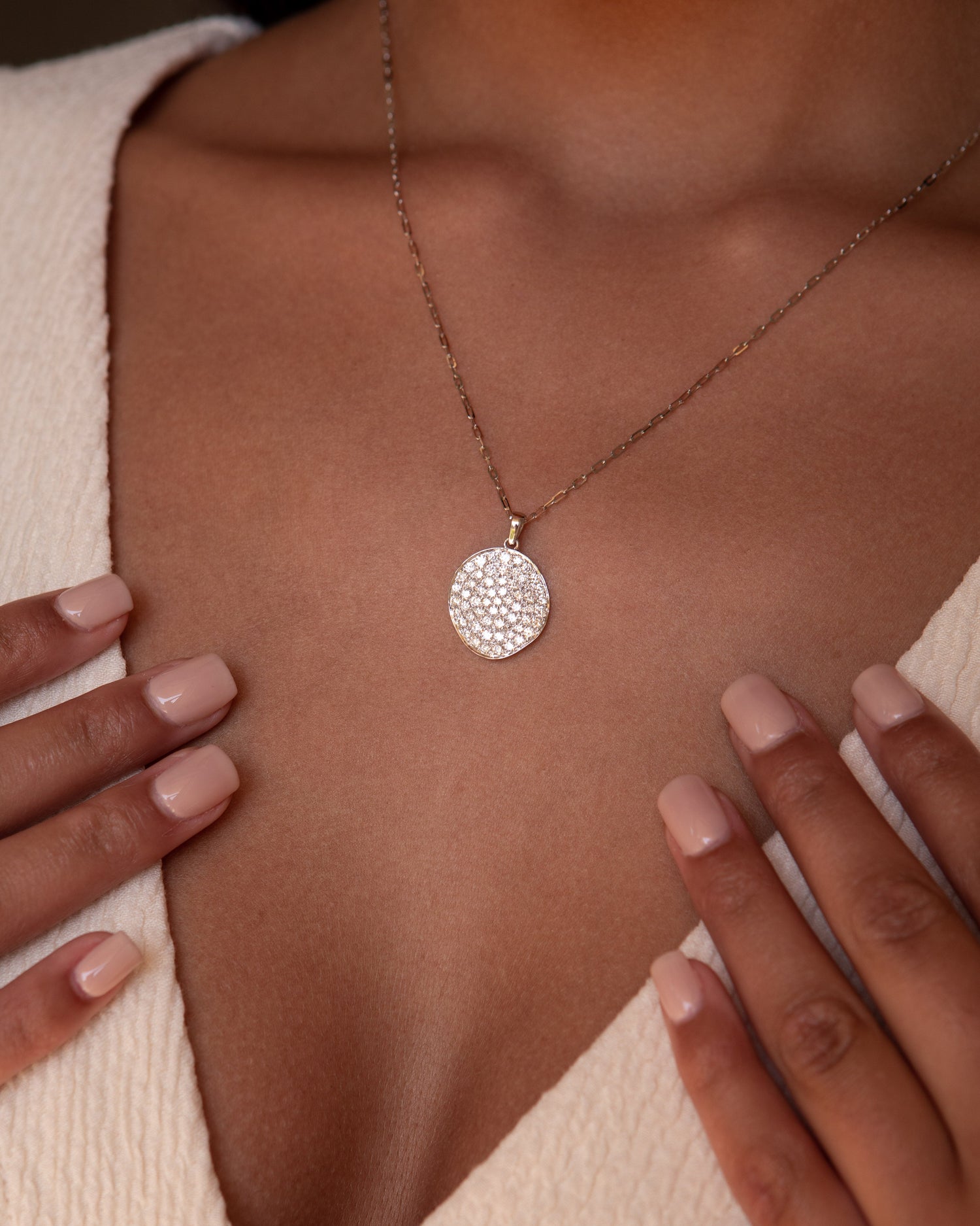 This Ora Nicole Diamond Disc Necklace radiates pure brilliance and sculptural elegance. The undulating diamond surface mimics the soft curvature of a petal, creating an organic, light-catching texture. Over a carat of prong-set white diamonds shimmer from every angle, making this piece a showstopper that commands attention. Designed for layering or as a dazzling standalone statement, it captures the spirit of modern luxury—bold yet graceful, radiant yet refined. A timeless design that celebrates the beauty of fluid form and luminous sparkle.