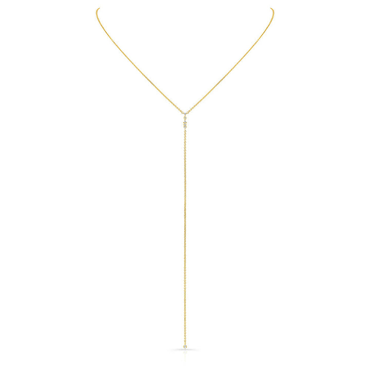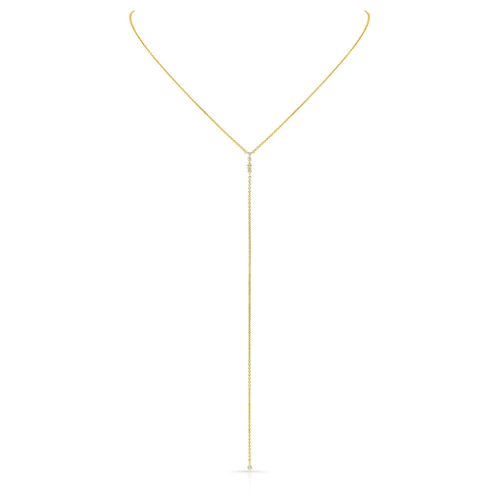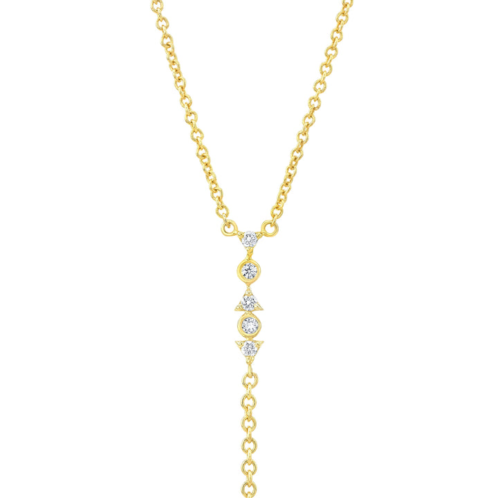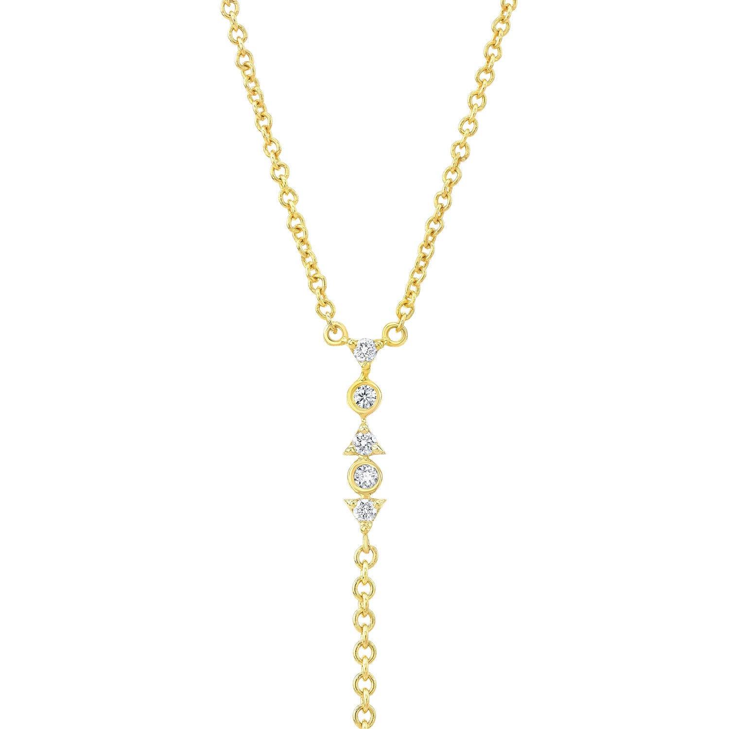 Crafted in 14K gold with geometric diamond stations totaling 0.13 carats. Features a 16–18 inch adjustable rolo chain with a 4.5-inch lariat drop. Prong and bezel-set diamonds. Lobster clasp. Available in yellow, white, or rose gold.