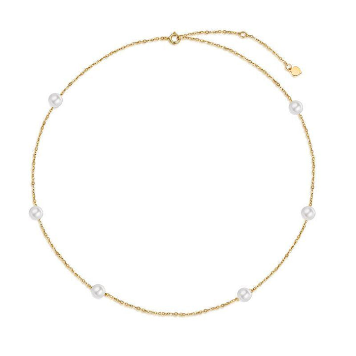 This bracelet is crafted from 14-karat solid gold and features round cultured pearls and gold beads on a chain.