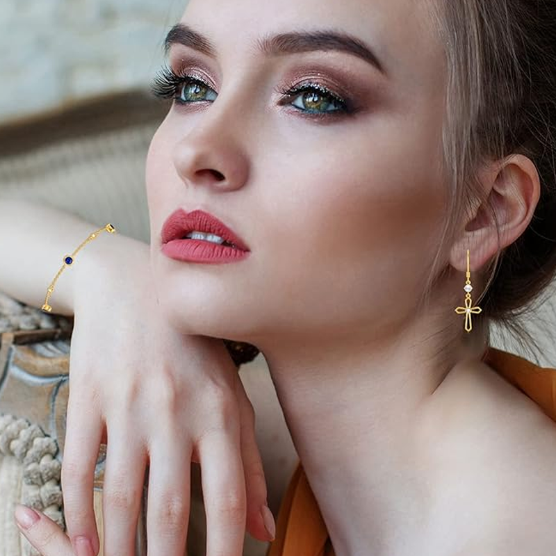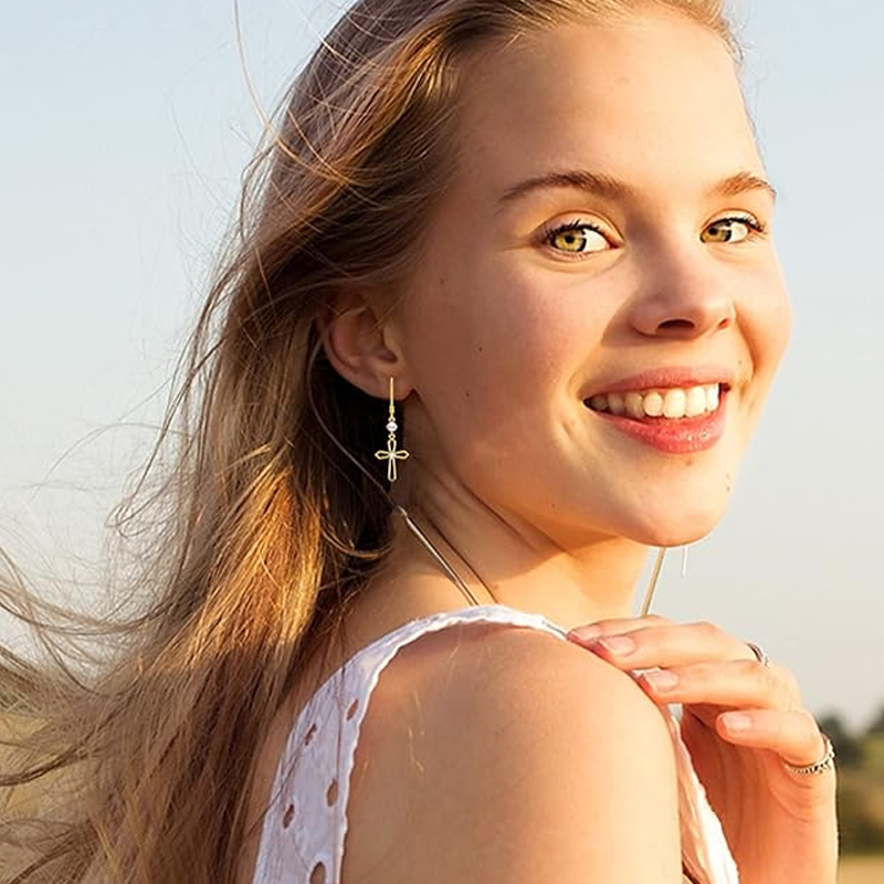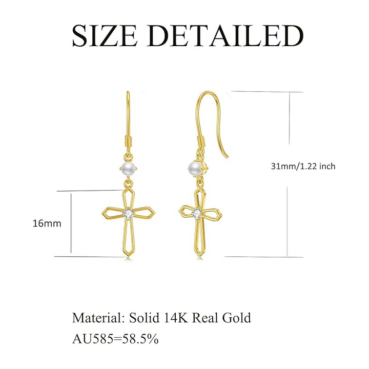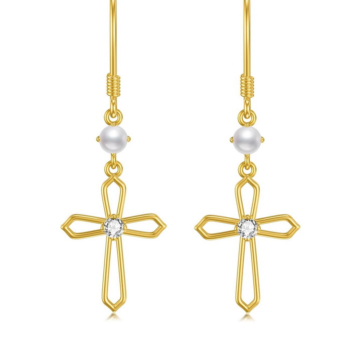 These Gold Vermeil Cubic Zirconia Pearl Cross Drop Earrings by YFN blend spiritual symbolism with modern, luxurious sophistication. The sterling silver base, plated with yellow gold (vermeil), combined with the sparkle of cubic zirconia and the classic elegance of pearls, creates a refined drop silhouette. The aesthetic is captivating and versatile, perfect for elevating an evening ensemble or adding a touch of elegance to professional wear. They symbolize grace and timeless beauty, offering the look of high-end jewelry with essential durability.
