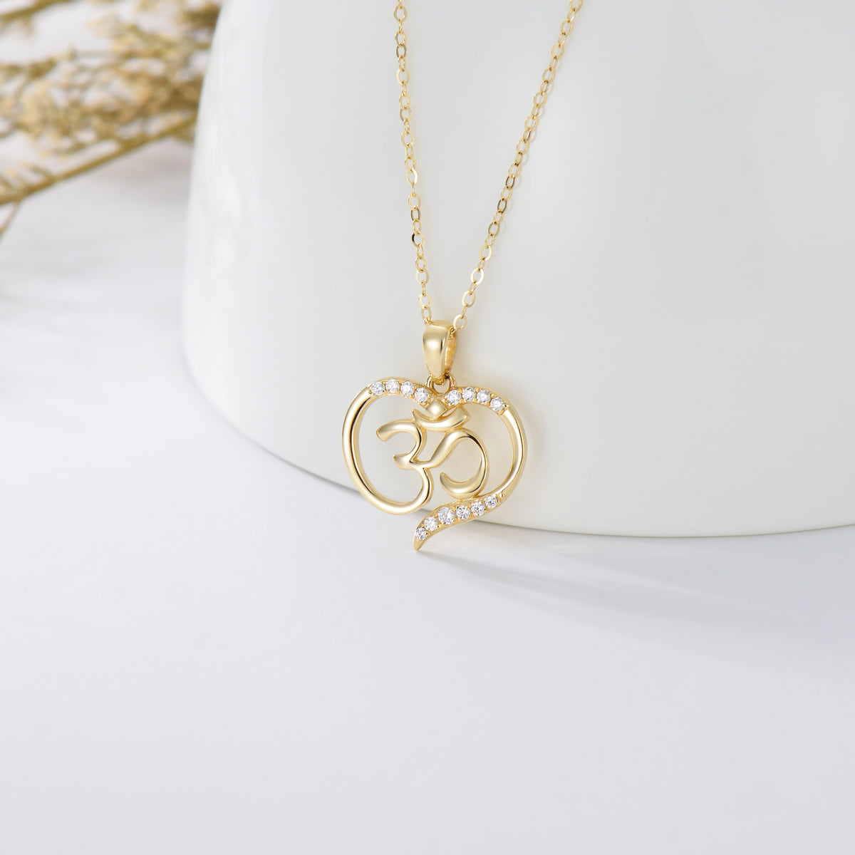 This pendant necklace is crafted from 14-karat solid gold, featuring a heart and Ohm symbol design set with a single round cubic zirconia stone.
