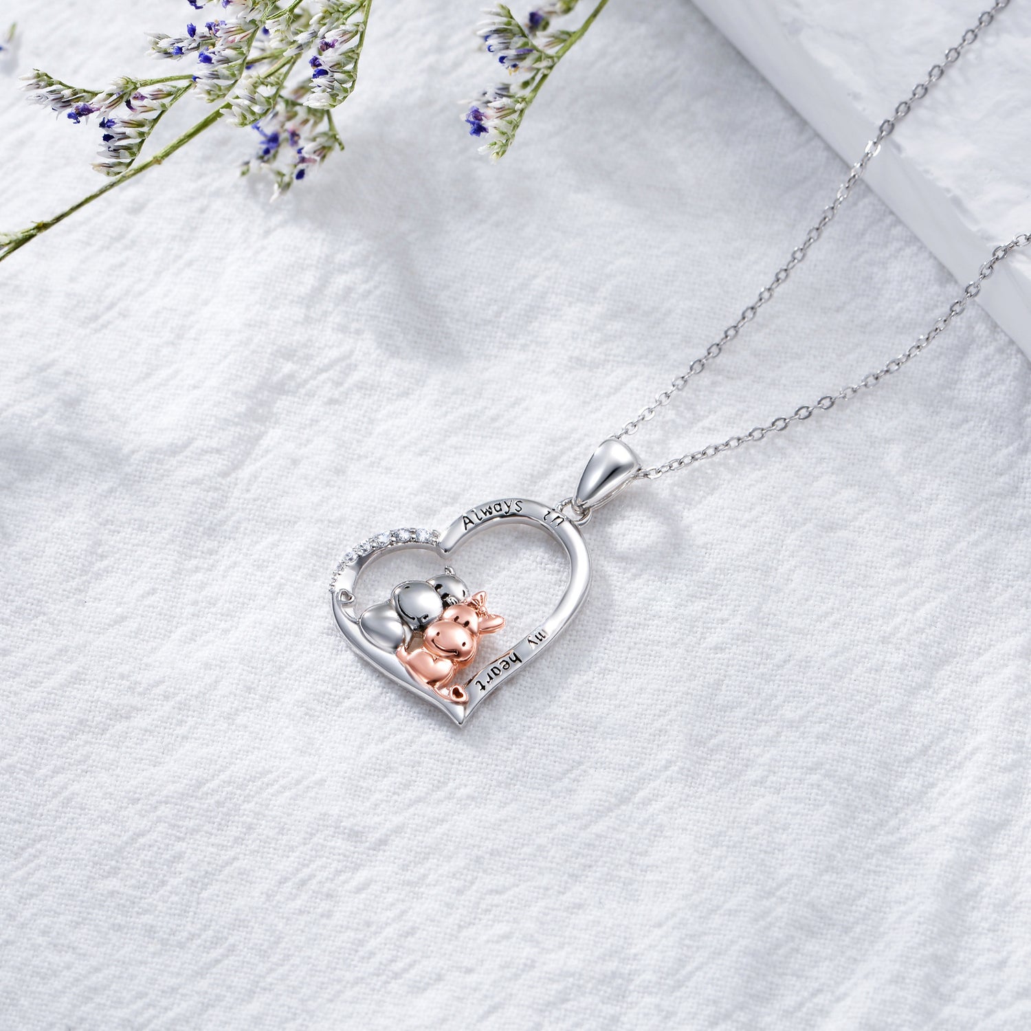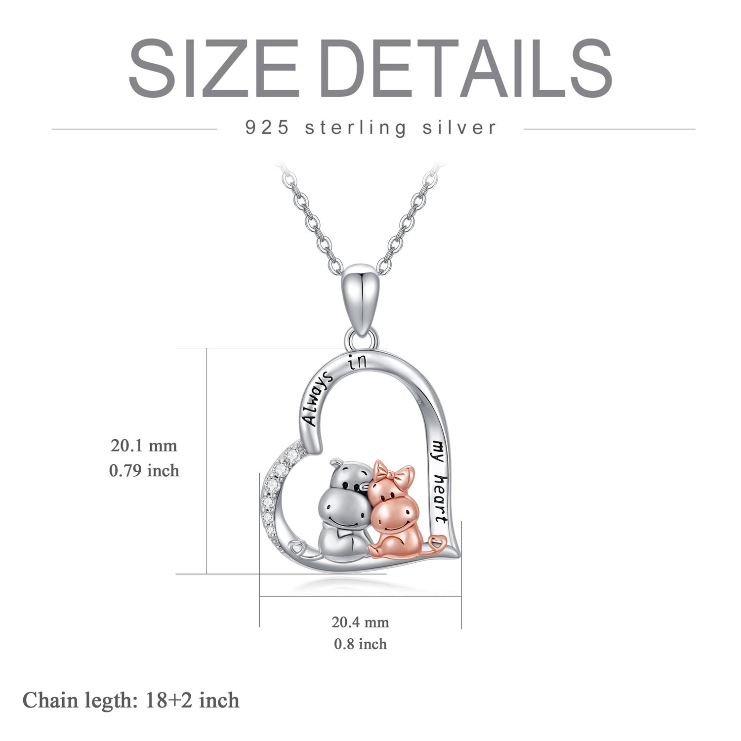 This pendant necklace is crafted from sterling silver with a silver and rose gold two-tone finish, featuring a circular hippo and heart design set with cubic zirconia crystals, and engraved with "Always In My Heart."