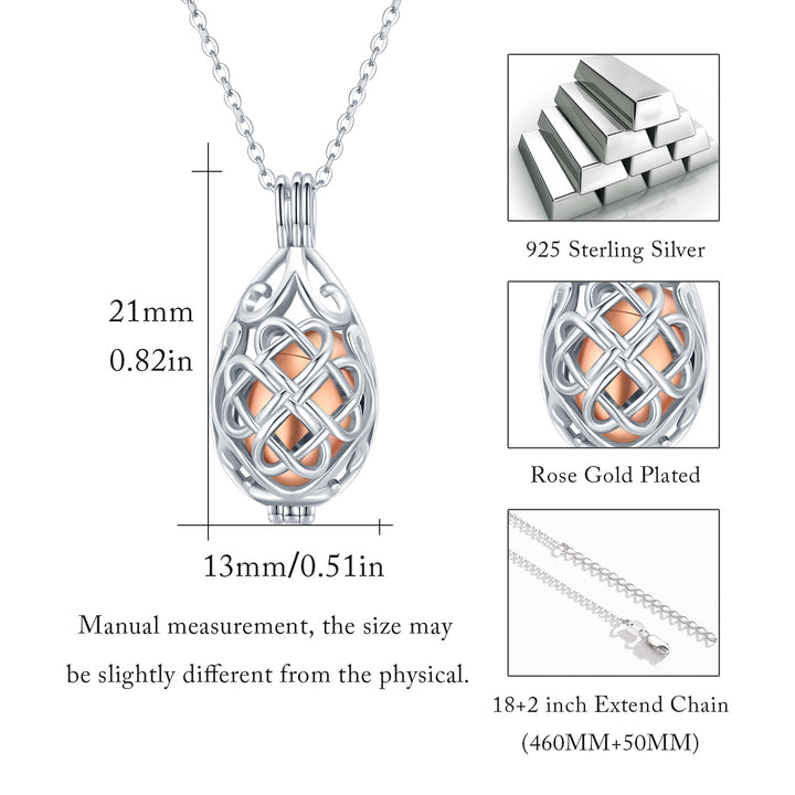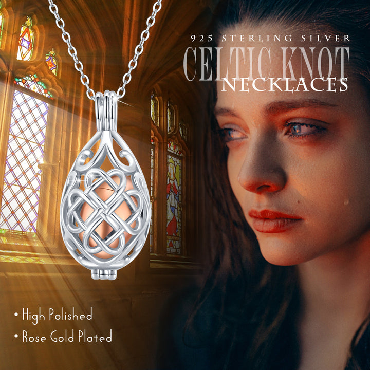 This urn necklace is crafted from sterling silver with a two-tone silver and rose gold finish, featuring a Celtic Knot design for storing ashes.