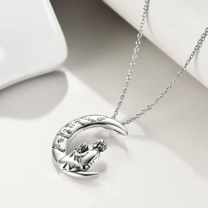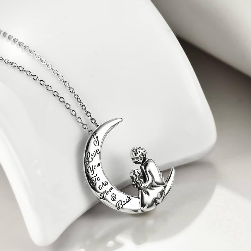 This pendant necklace is crafted from sterling silver, plated with white gold, featuring a moon design engraved with "I Love You To The Moon And Back."
