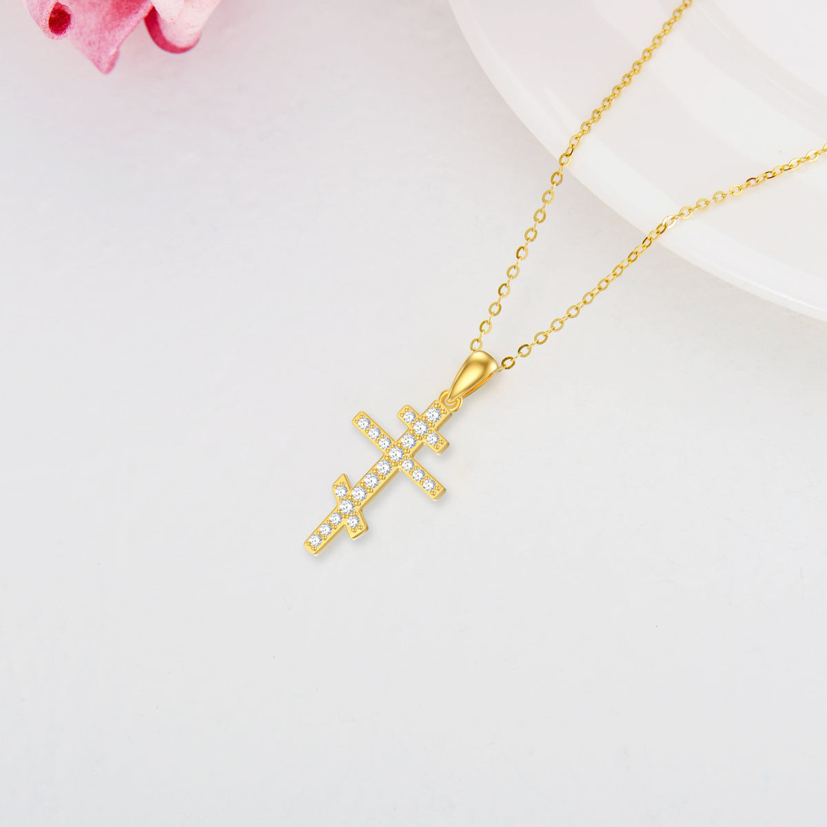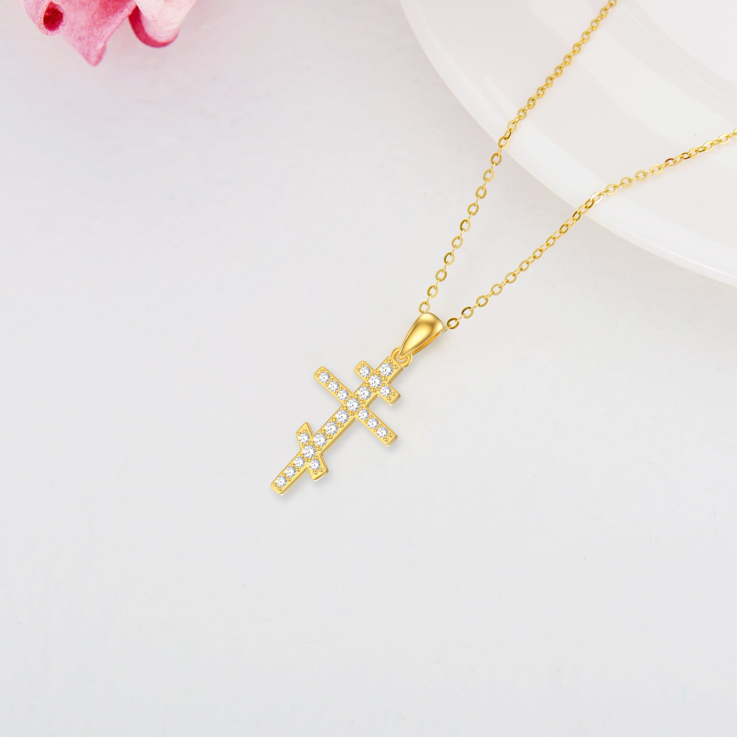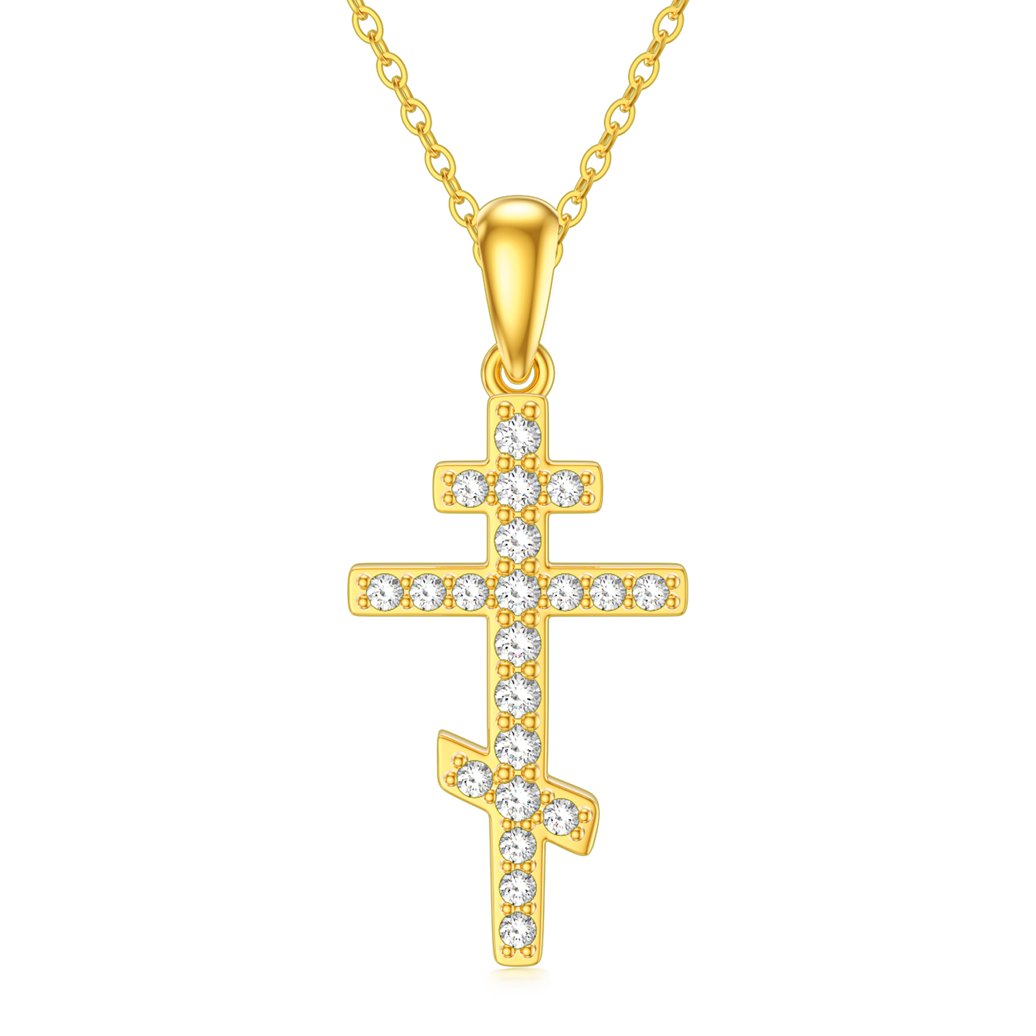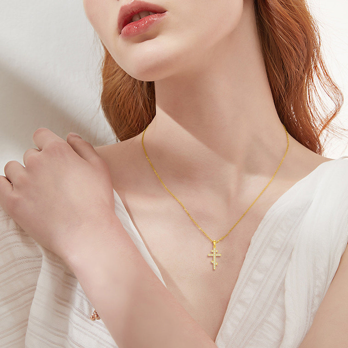 This pendant necklace is crafted from 14K solid gold and features a cross design set with multiple cubic zirconia stones.