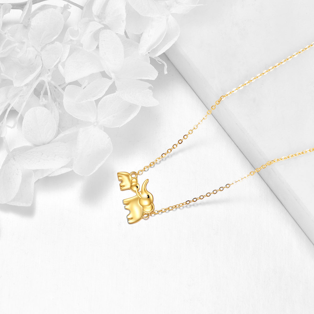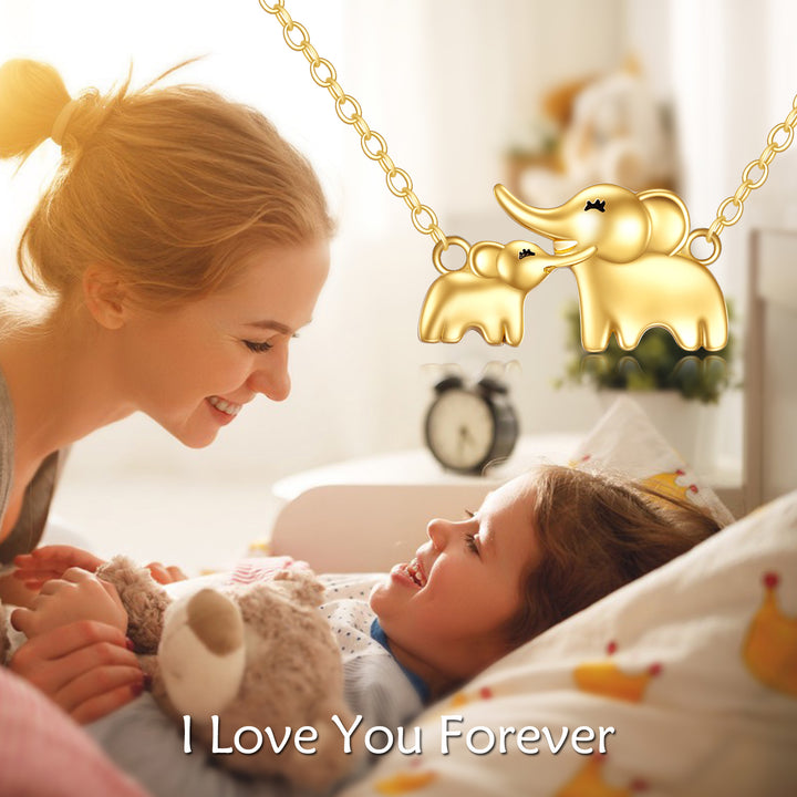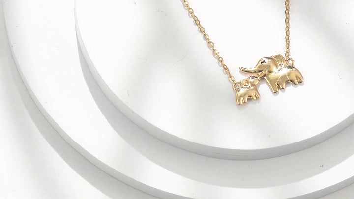 This pendant necklace is crafted from 14K solid gold and features a mother and daughter elephant design without any stones.