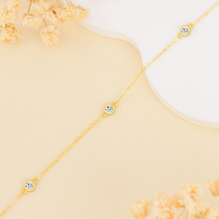 This 14K Gold Moissanite Round Charm Bracelet by YFN is a luxurious foundation for personal storytelling. The bracelet is adorned with stunning round Moissanite stones that shimmer with exceptional brilliance, set in high-quality 14K gold. The aesthetic is elegant, customizable, and radiant. This piece is designed to be personalized with your own charms, allowing you to create a unique reflection of your personality. It stands as a timeless addition to any collection, blending the fire of Moissanite with the warmth of gold.