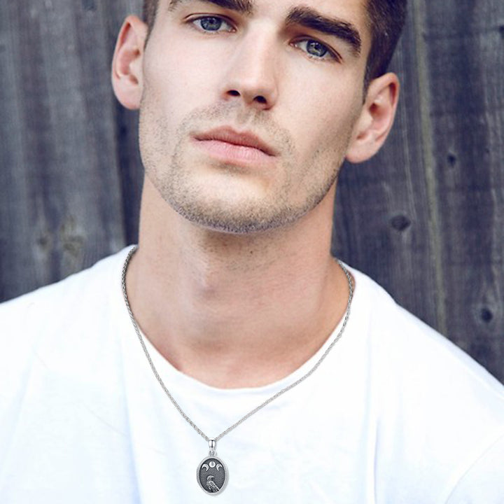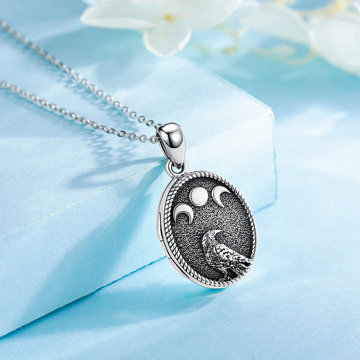 This unisex locket necklace is crafted from sterling silver with a retro silver finish, featuring eagle, moon, and sun designs and space for a personalized photo.