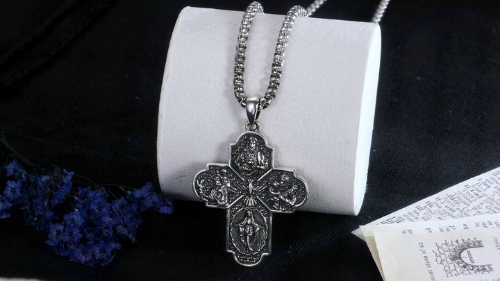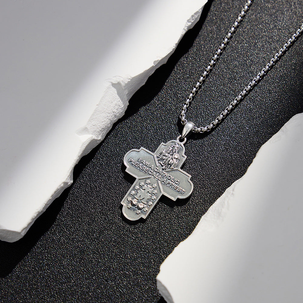 This Sterling Silver Cross & Saint Christopher Pendant Necklace by YFN is a meaningful blend of faith and vintage style. The retro silver finish highlights the beautifully detailed cross and the patron saint, Saint Christopher. The aesthetic is classic, spiritual, and stone-free. This necklace is a versatile accessory, perfect for daily wear, offering a sense of protection and comfort while adding a timeless, elegant touch to any woman's collection.