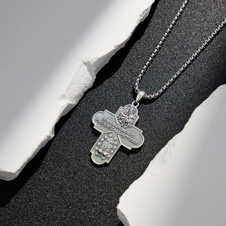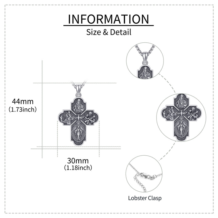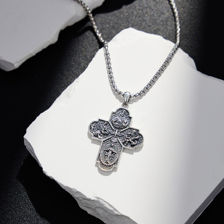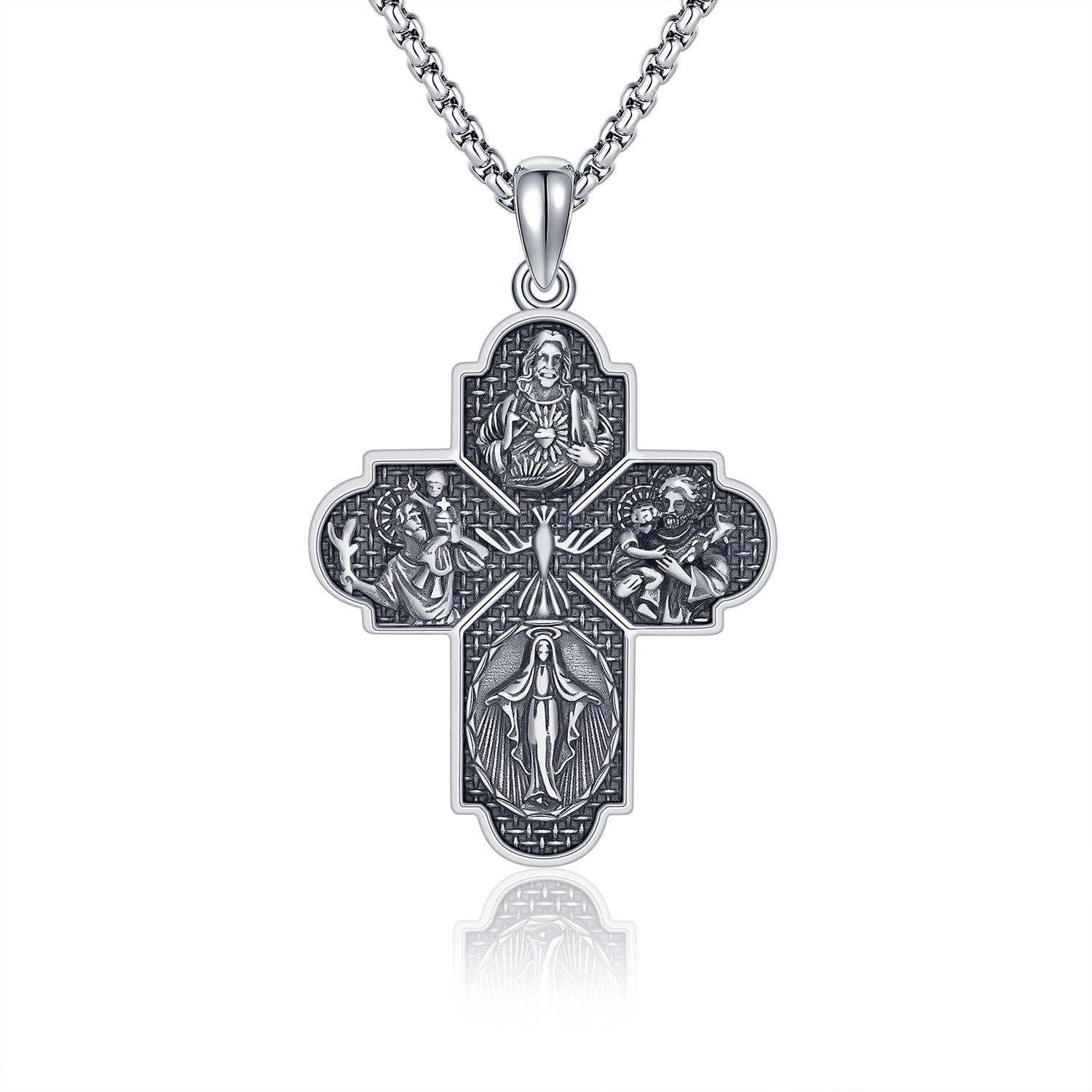 This pendant necklace is crafted from sterling silver with a retro silver finish and features a cross and Saint Christopher design without any stones.