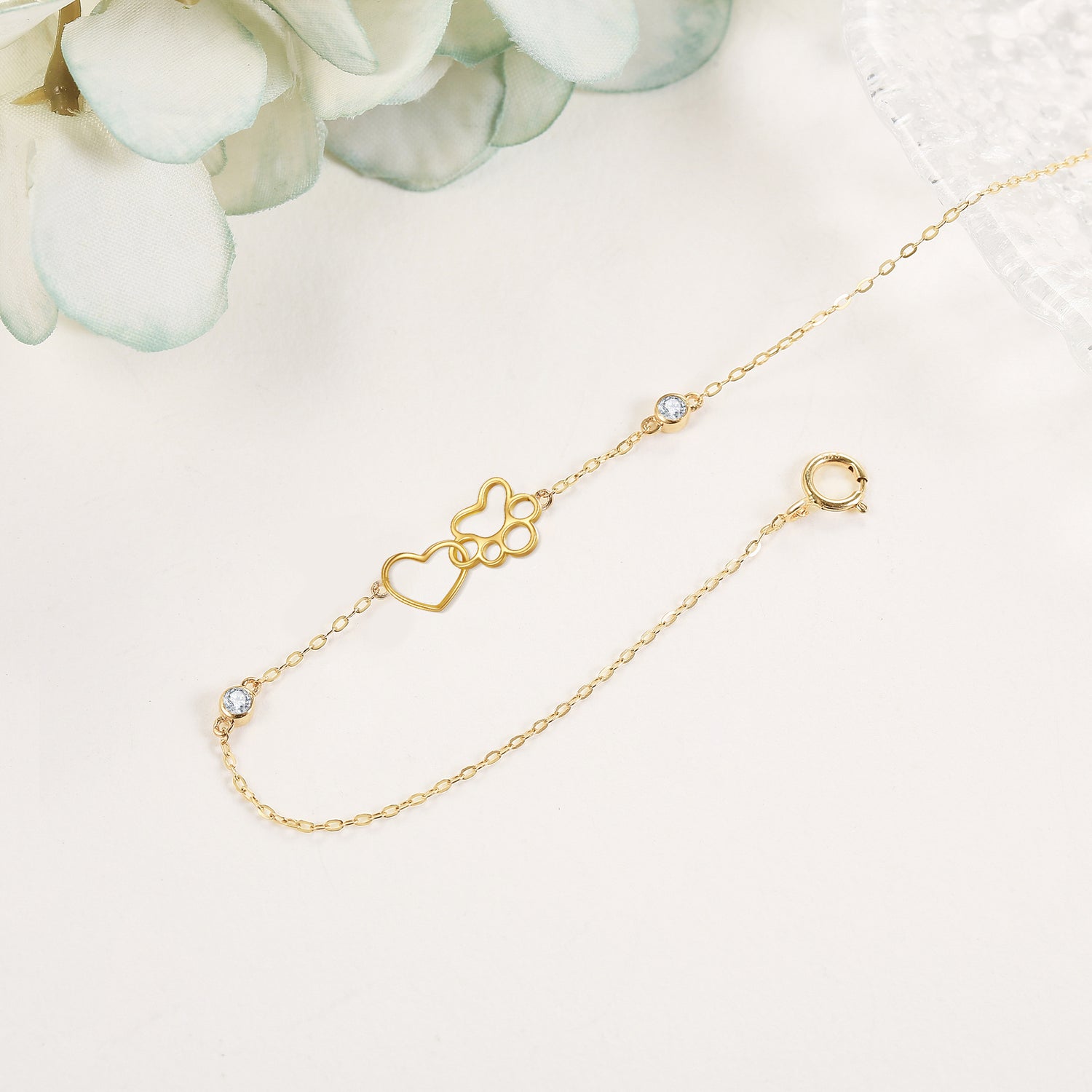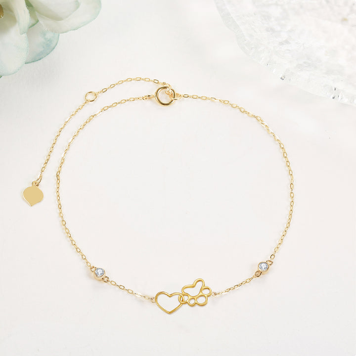 14K Gold Cubic Zirconia Paw & Heart Charm Bracelet
