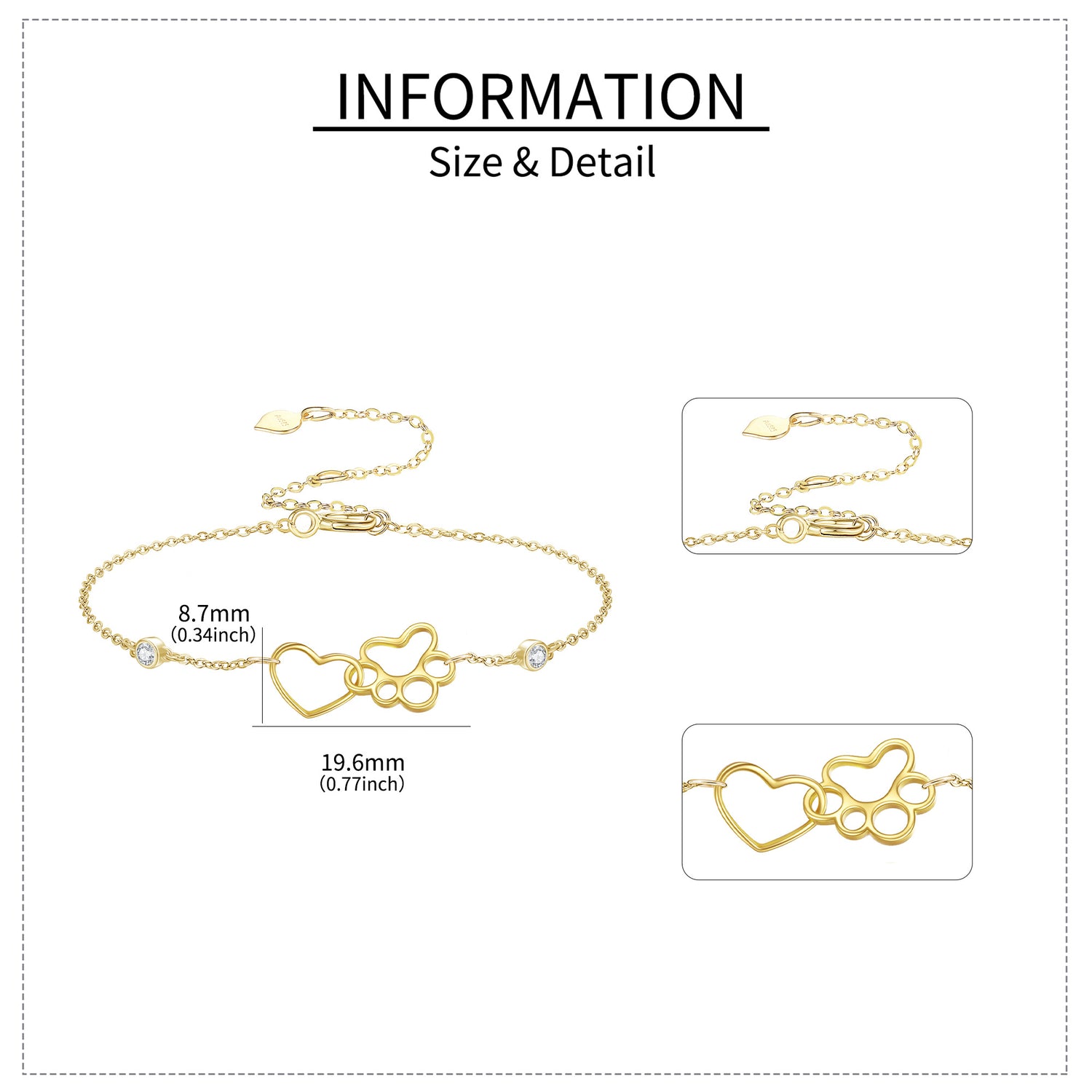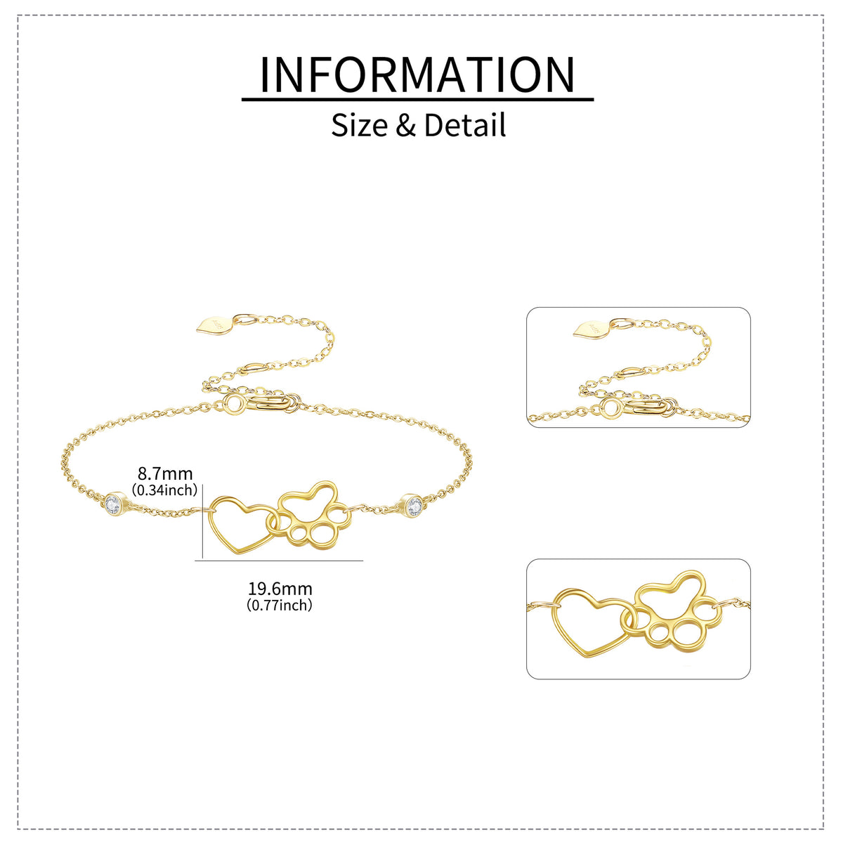 Crafted from 14K solid gold. Designed as a charm bracelet. Features heart and paw designs. Embellished with Cubic Zirconia stones.