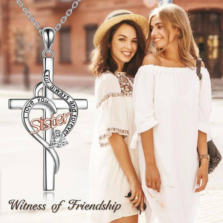 Sterling Silver Two-tone Zircon Sisters & Cross Pendant Necklace