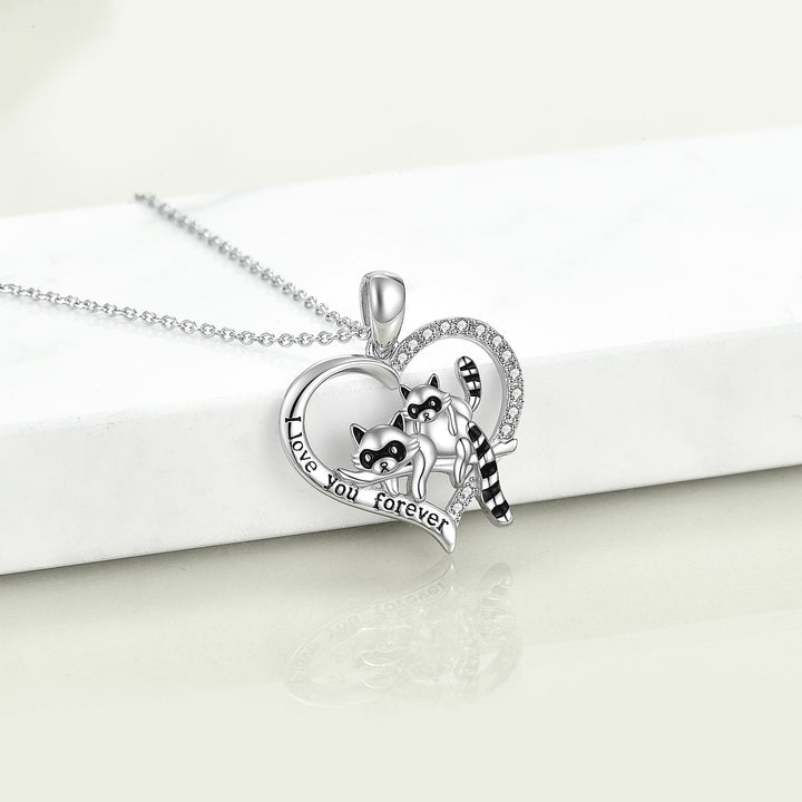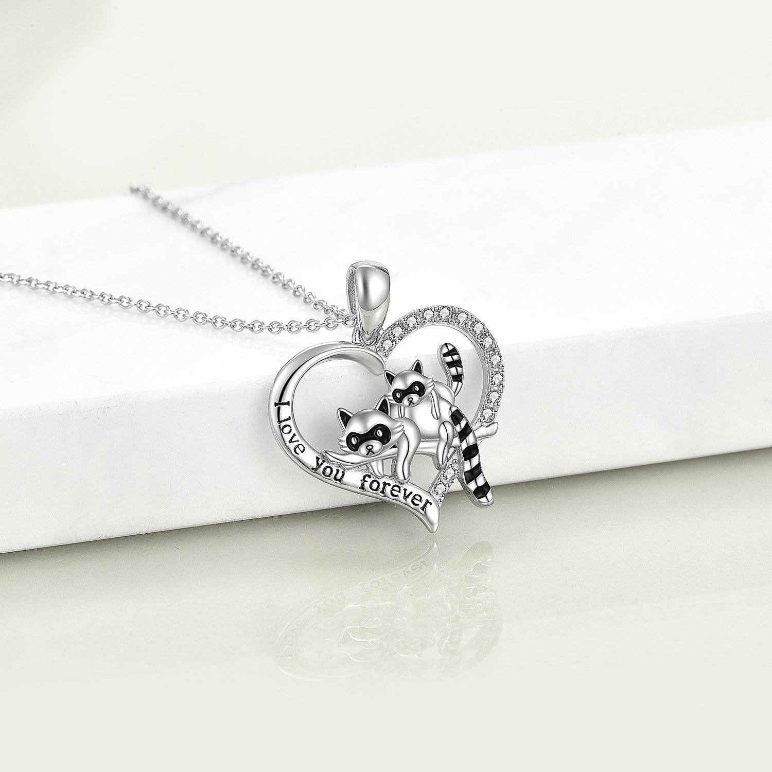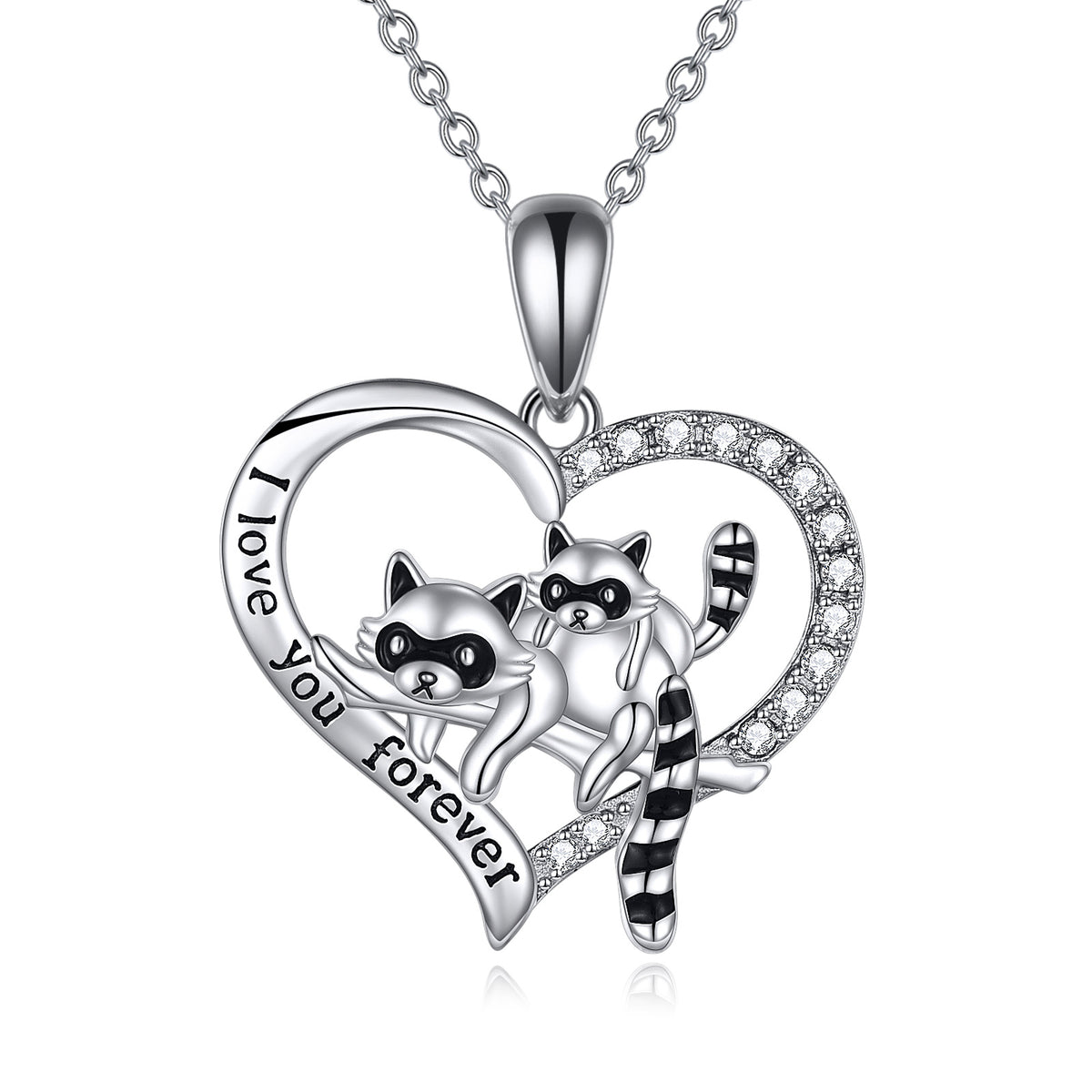 Sterling Silver Round Zircon Raccoon & Heart Pendant Necklace with Engraved Word