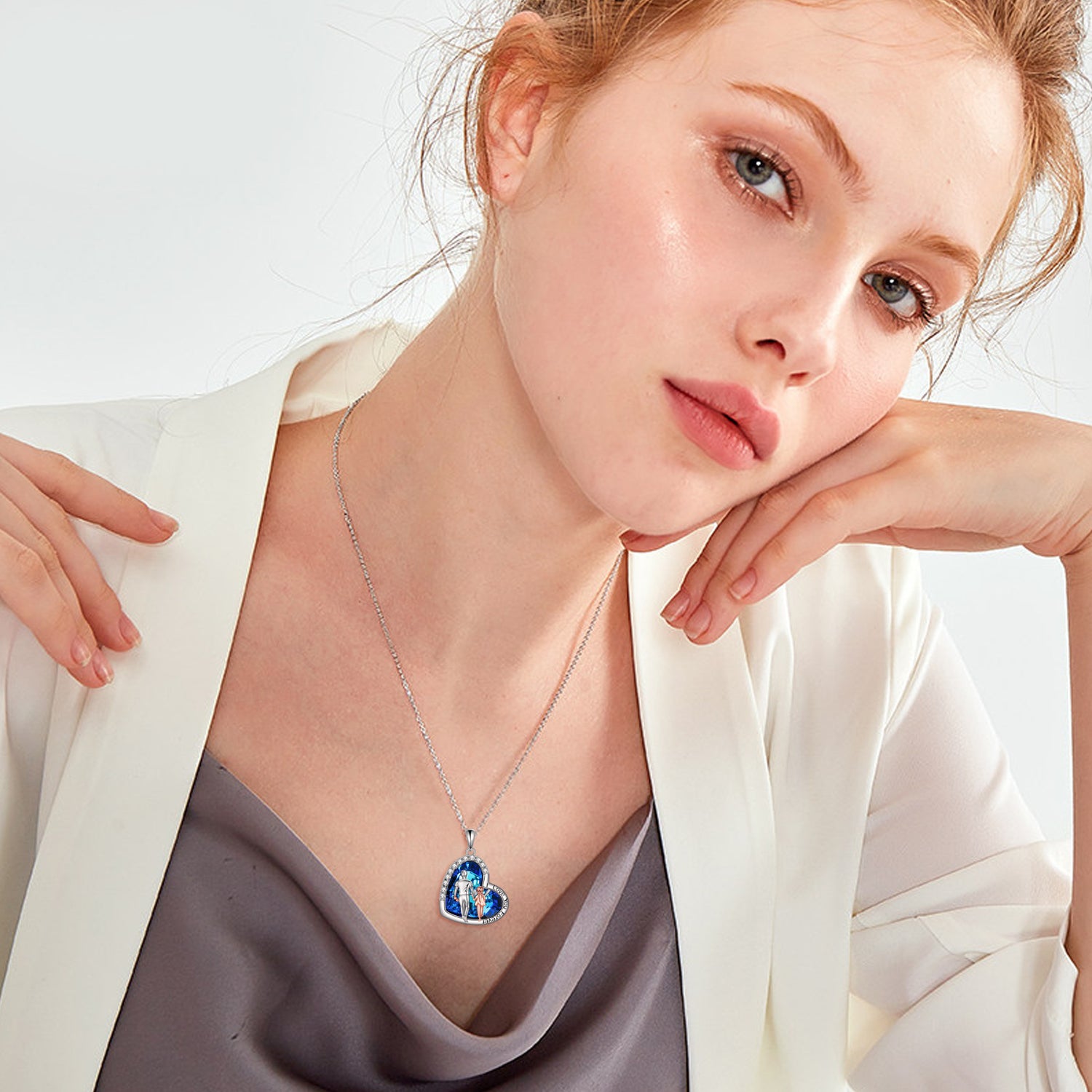 Sterling silver; rose gold accents; blue crystal; heart pendant; engraved wording; silver chain.