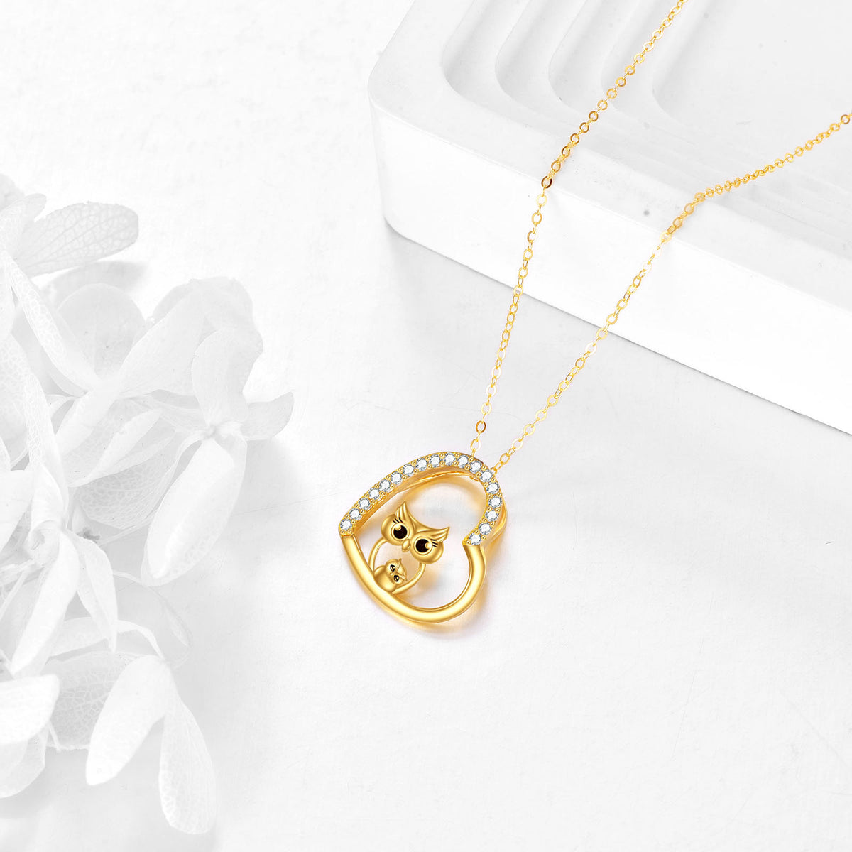 14K gold; cubic zirconia; owl and heart motif; gold chain.