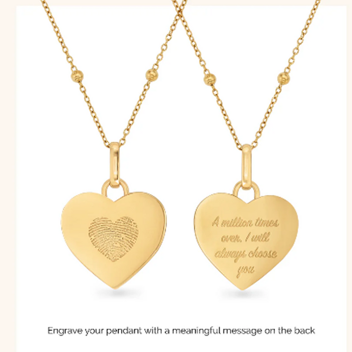 Crafted from 14K solid gold. Features a heart pendant with personalized engraving and a customized fingerprint design. Stone-free design.