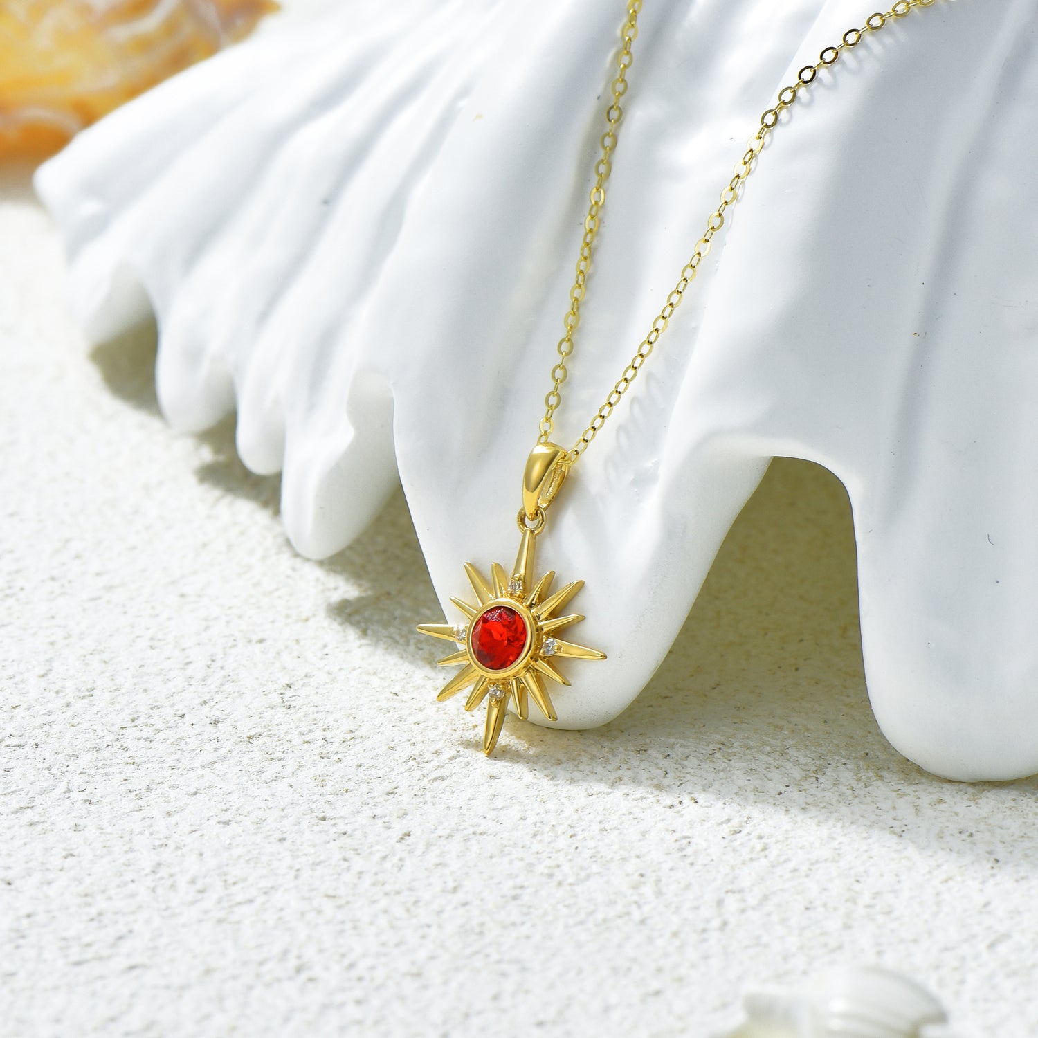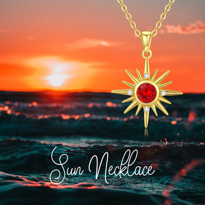 Crafted in 14K gold. Features sun-shaped pendant with crystal accents. Includes matching gold chain.