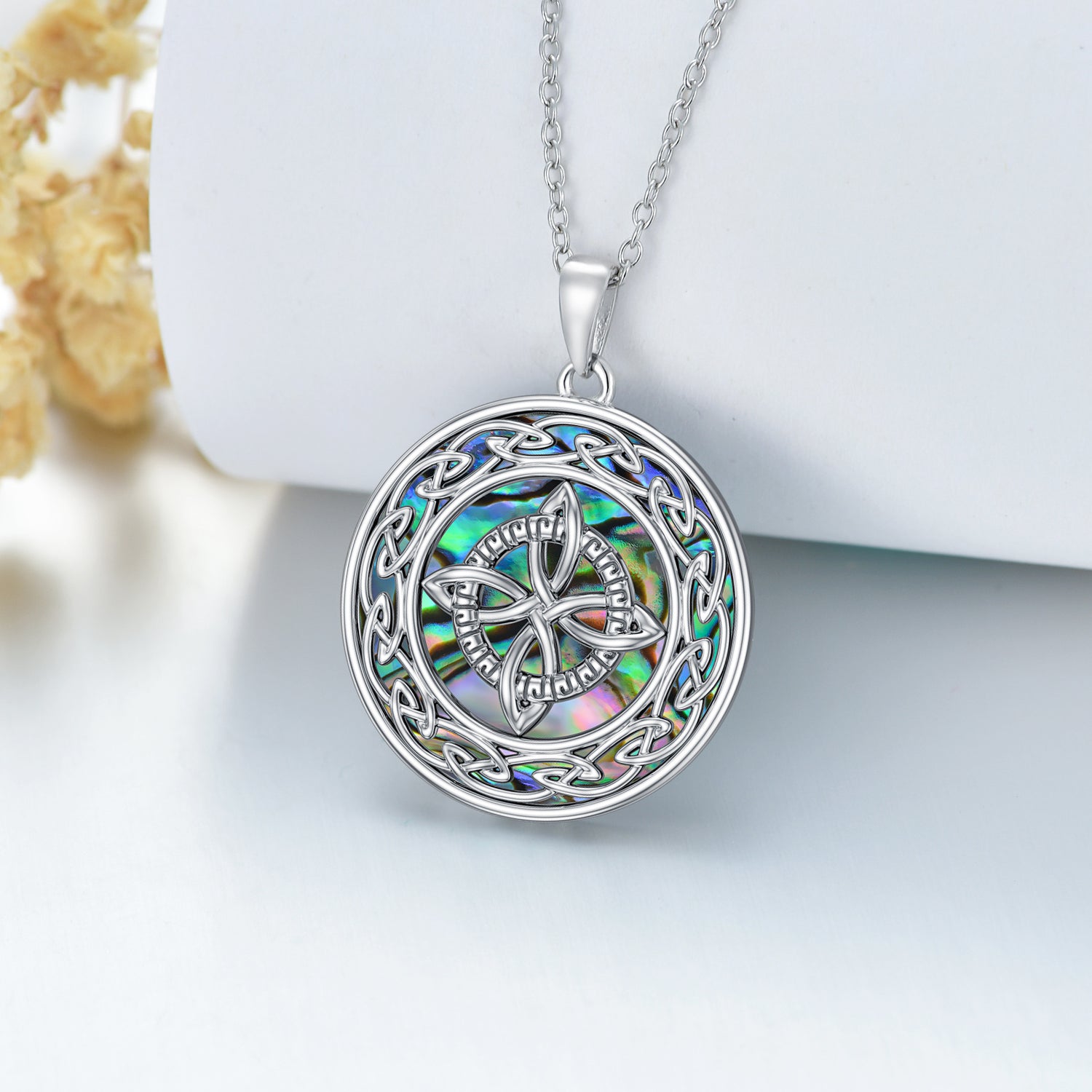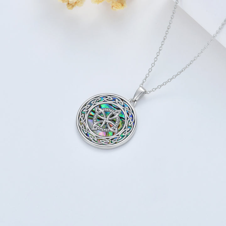 Pendant necklace in sterling silver, white gold plated, featuring a circular motif with a natural abalone shellfish inlay. Detailed with Celtic Knot and Witch Knot designs. Pendant measures 1.05 inches by 0.80 inches on an 18-inch rolo chain with a spring-ring clasp.