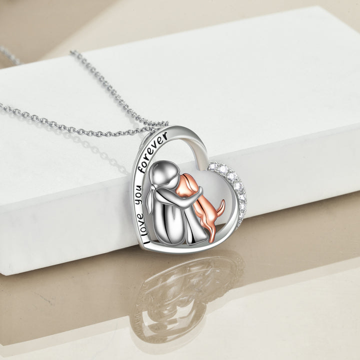 Sterling Silver Two-tone Cubic Zirconia Girl Hugs Dog Heart Pendant Necklace with Engraved Word