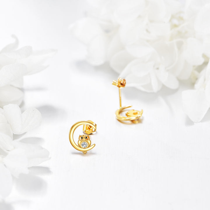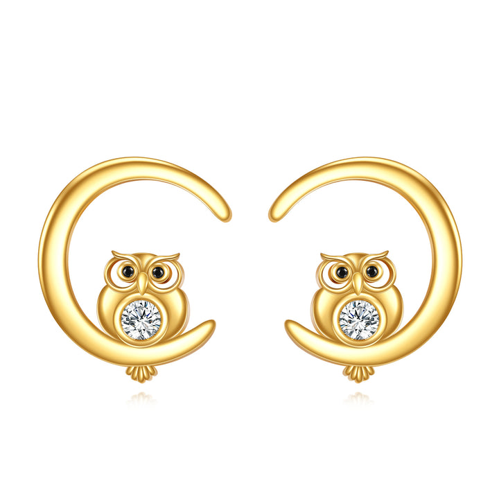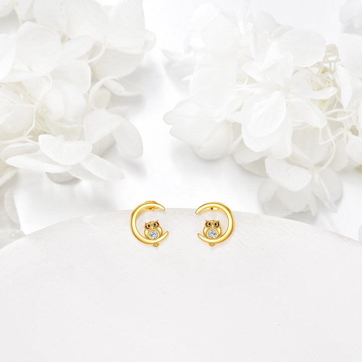 These Owl Stud Earrings are crafted from 14K Gold, Featuring Sparkling Cubic Zirconia.