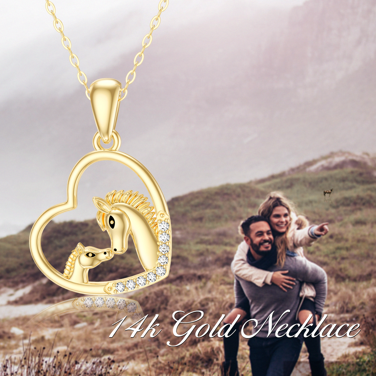 This Pendant Necklace is crafted from 14K Gold, Featuring a Horse-Shaped Heart Motif Adorned with Brilliant Cubic Zirconia.
