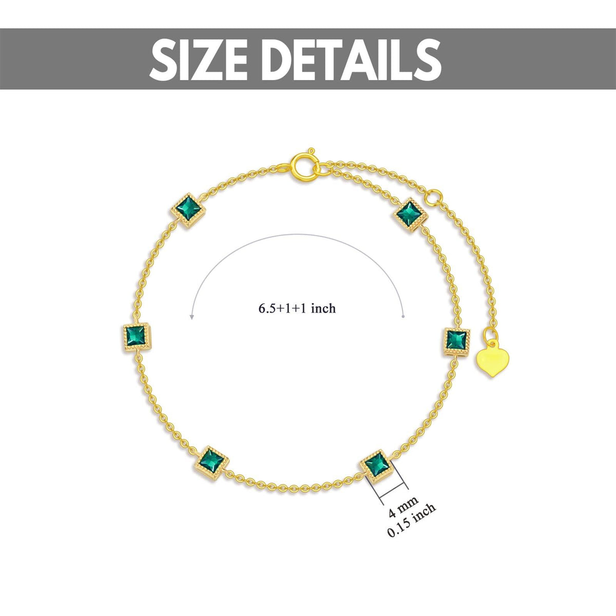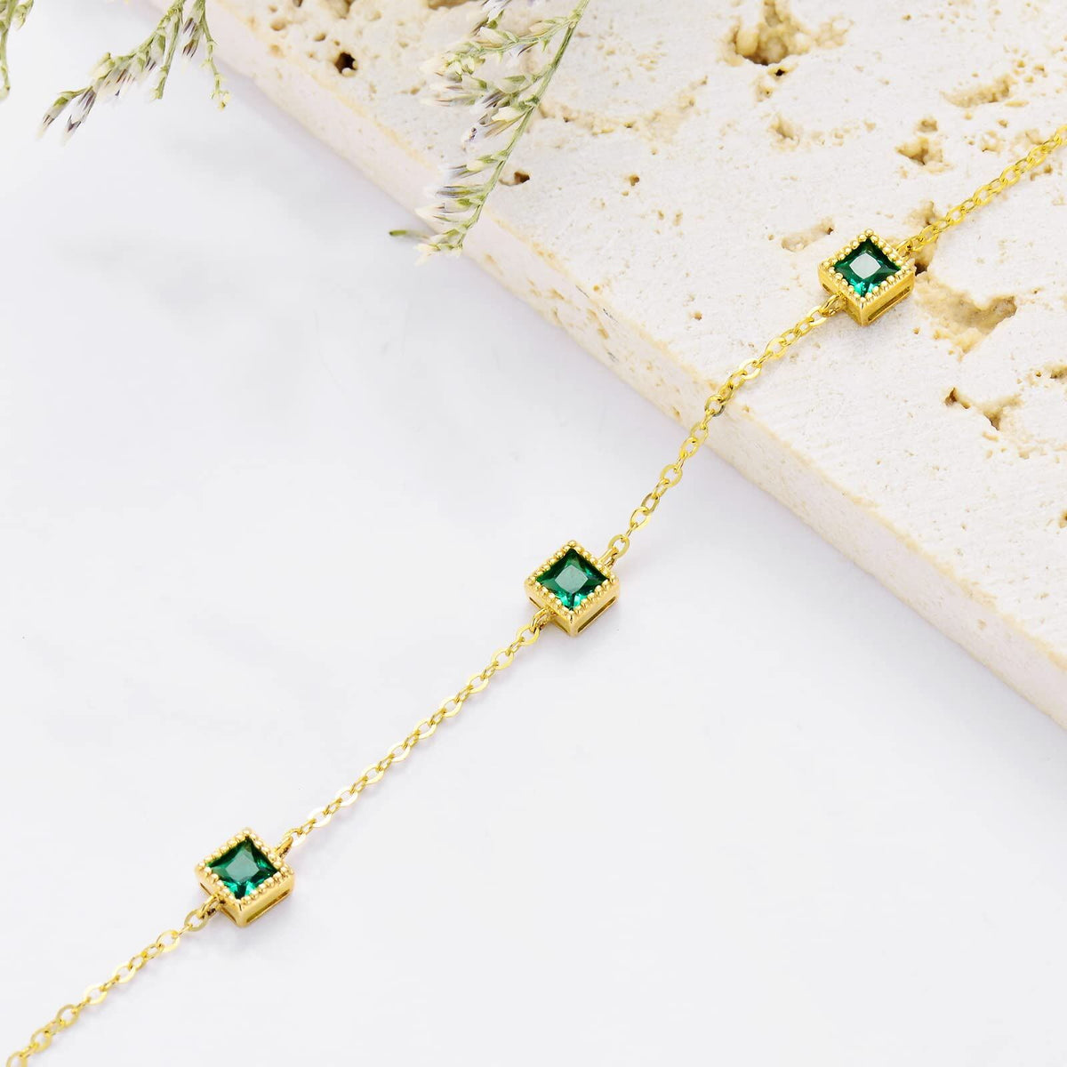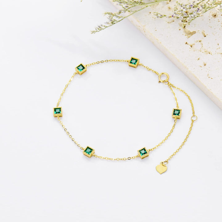 14K Gold Princess-square Shaped Emerald Charm Bracelet