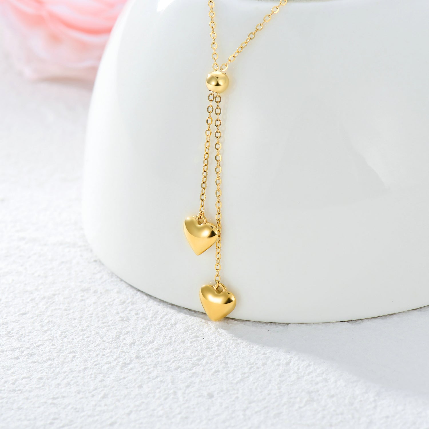 9K gold; adjustable Y-necklace design; heart charm; gold chain.