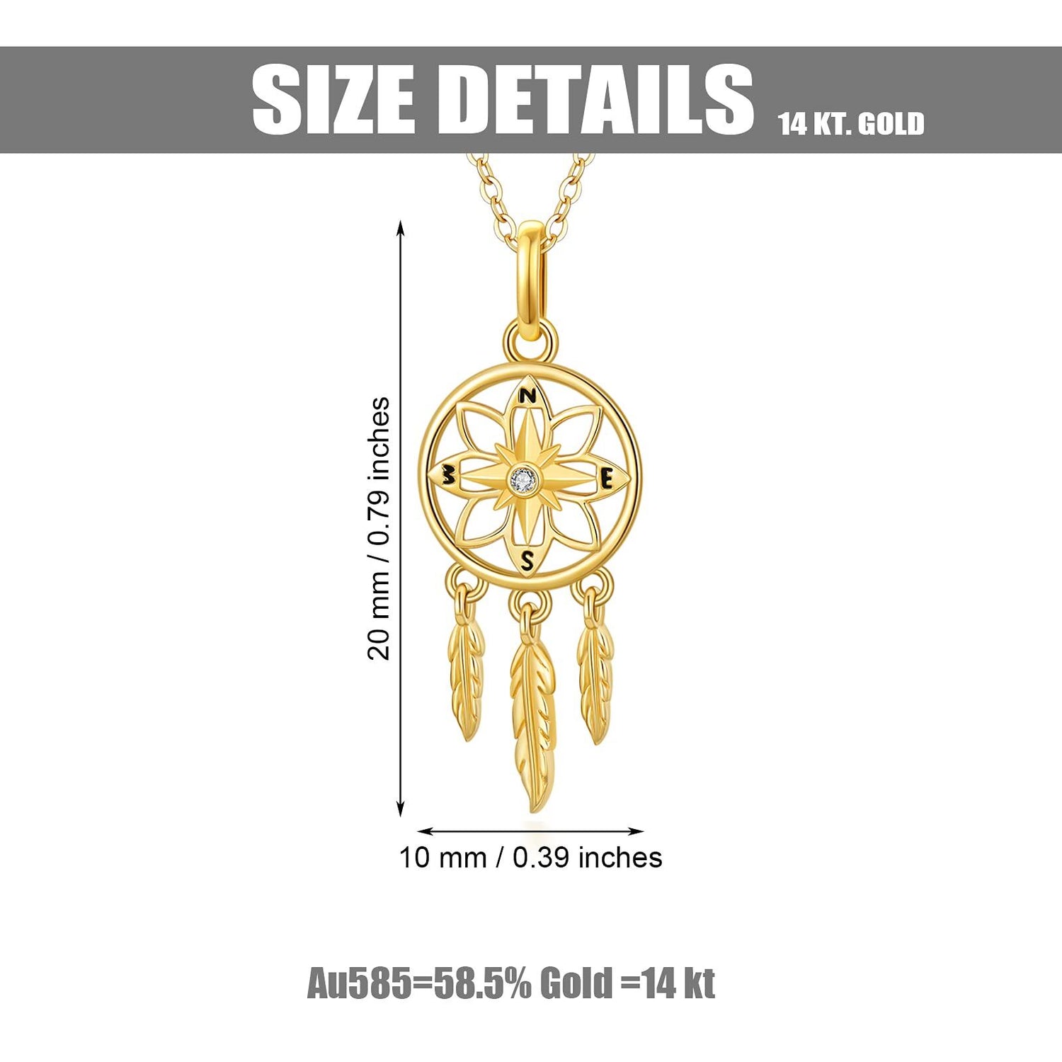 14K gold; Cubic Zirconia; dream catcher motif; pendant with chain.