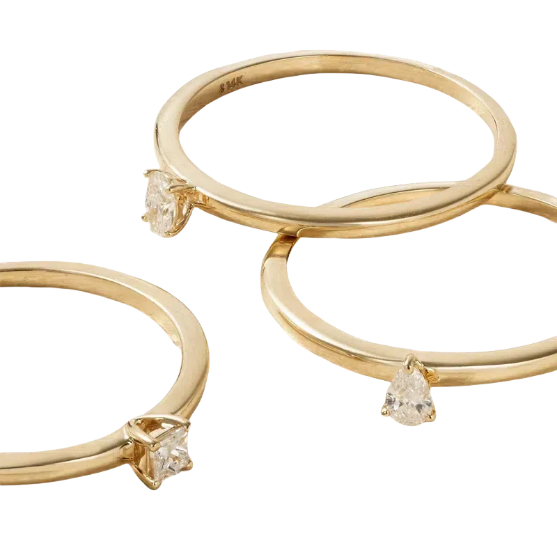 Solitaire wedding ring/band crafted from solid 14K gold, featuring oval, Princess, and pear lab-created diamond center/side stones (0.6 CT total weight, D color, VVS1-VS1 clarity). Features personalized engraving option.