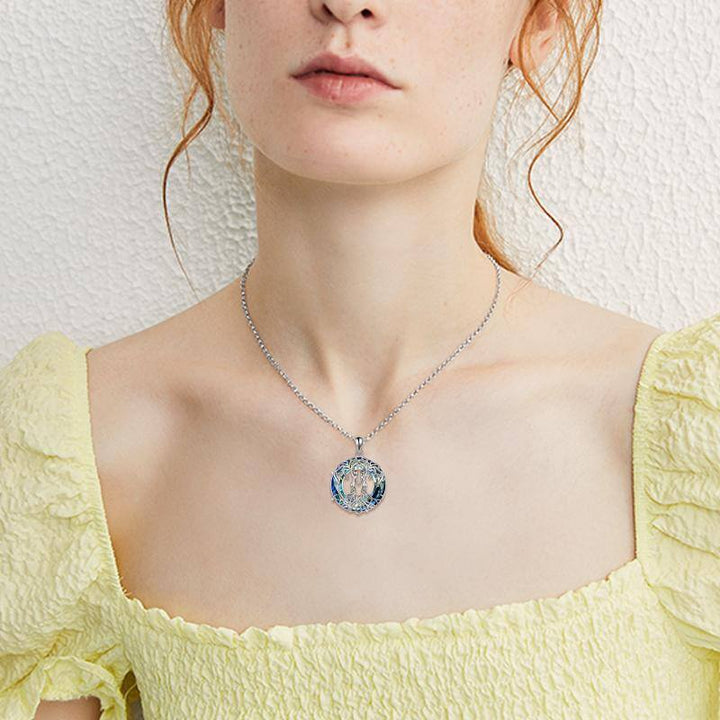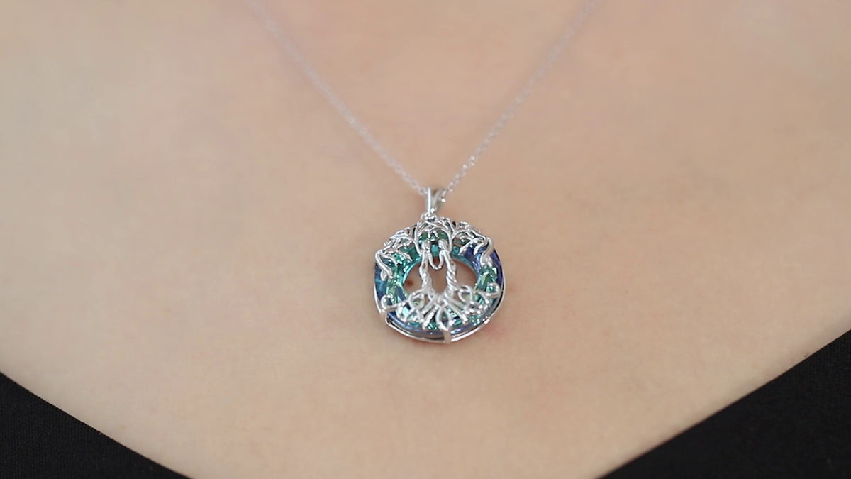 This Circular Shaped Crystal Pendant Necklace is crafted from Sterling Silver with White Gold Plating, Featuring a Blue Crystal and a Tree of Life Motif.